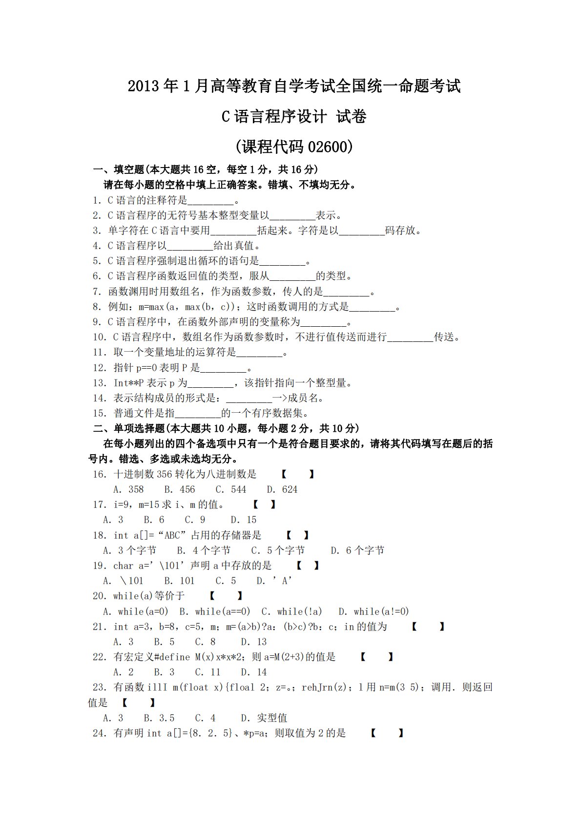 2013年1月高等教育自学考试全国统一命题考试C语言程序设计试卷(课程代码02600)一、填空题(本大题共16空,每空1分,共16分)请在每小题的空格中填上正确答案。错填、不填均无分。1.C语言的注释符是_________。2.C语言程序的无符号基本整型变量以_________表示。3.单字符在C语言中要用_________括起来。字符是以_________码存放。4.C语言程序以_________给出真值。5.C语言程序强制退出循环的语句是_________。6.C语言程序函数返回值的类型,服从_________的类型。7.函数渊用时用数组名,作为函数参数,传人的是_________。8.例...