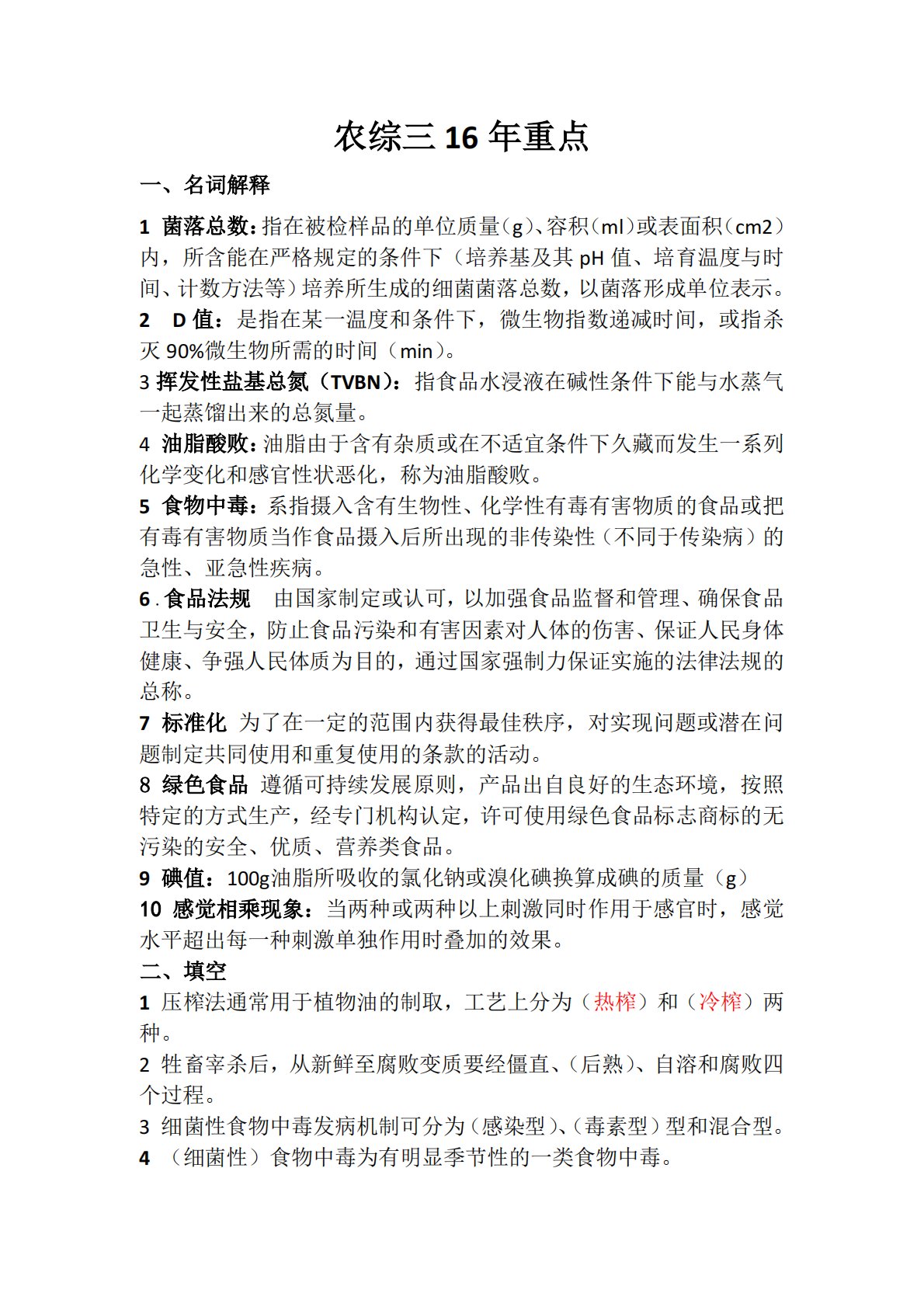 农综三16年重点一、名词解释1菌落总数:指在被检样品的单位质量(g)、容积(ml)或表面积(cm2)内,所含能在严格规定的条件下(培养基及其pH值、培育温度与时间、计数方法等)培养所生成的细菌菌落总数,以菌落形成单位表示。2D值:是指在某一温度和条件下,微生物指数递减时间,或指杀灭90%微生物所需的时间(min)。3挥发性盐基总氮(TVBN):指食品水浸液在碱性条件下能与水蒸气一起蒸馏出来的总氮量。4油脂酸败:油脂由于含有杂质或在不适宜条件下久藏而发生一系列化学变化和感官性状恶化,称为油脂酸败。5食物中毒:系指摄入含有生物性、化学性有毒有害物质的食品或把有毒有害物质当作食品摄入后所出现的非传染...