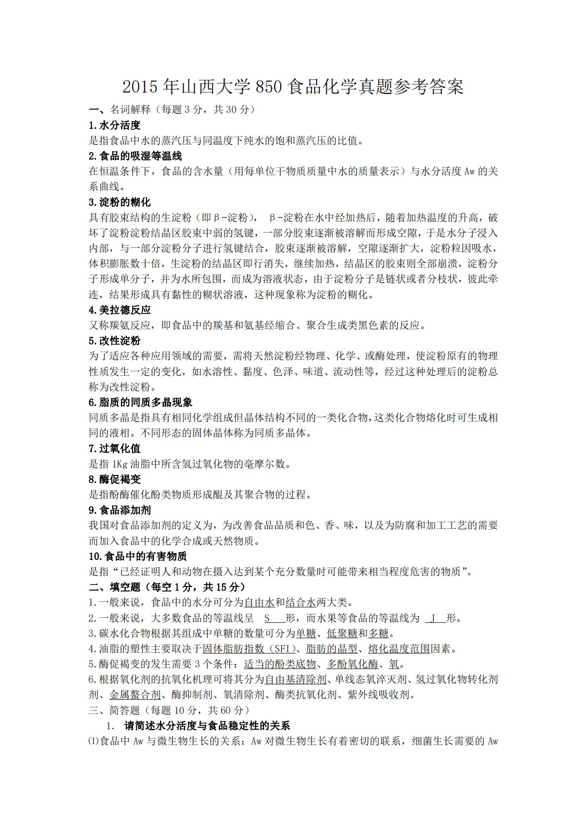 2015年山西大学850食品化学真题参考答案一、名词解释(每题3分,共30分)1.水分活度是指食品中水的蒸汽压与同温度下纯水的饱和蒸汽压的比值。2.食品的吸湿等温线在恒温条件下,食品的含水量(用每单位干物质质量中水的质量表示)与水分活度Aw的关系曲线。3.淀粉的糊化具有胶束结构的生淀粉(即β-淀粉),β-淀粉在水中经加热后,随着加热温度的升高,破坏了淀粉淀粉结晶区胶束中弱的氢键,一部分胶束逐渐被溶解而形成空隙,于是水分子浸入内部,与一部分淀粉分子进行氢键结合,胶束逐渐被溶解,空隙逐渐扩大,淀粉粒因吸水,体积膨胀数十倍,生淀粉的结晶区即行消失,继续加热,结晶区的胶束则全部崩溃,淀粉分子形成单分子...