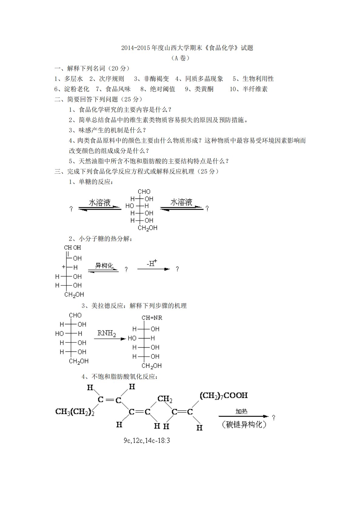 2014-2015年度山西大学期末《食品化学》试题(A卷)一、解释下列名词(20分)1、多层水2、次序规则3、非酶褐变4、同质多晶现象5、生物利用性6、淀粉老化7、食品风味8、绝对阈值9、类黄酮10、半纤维素二、简要回答下列问题(25分)1、食品化学研究的主要内容是什么?2、简单总结食品中的维生素类物质容易损失的原因及预防措施。3、味感产生的机制是什么?4、肉类食品原料中的颜色主要由什么物质形成?这种物质中最容易受环境因素影响而改变颜色的组成成分是什么?5、天然油脂中所含不饱和脂肪酸的主要结构特点是什么?三、完成下列食品化学反应方程式或解释反应机理(25分)1、单糖的反应:2、小分子糖的热分解...
