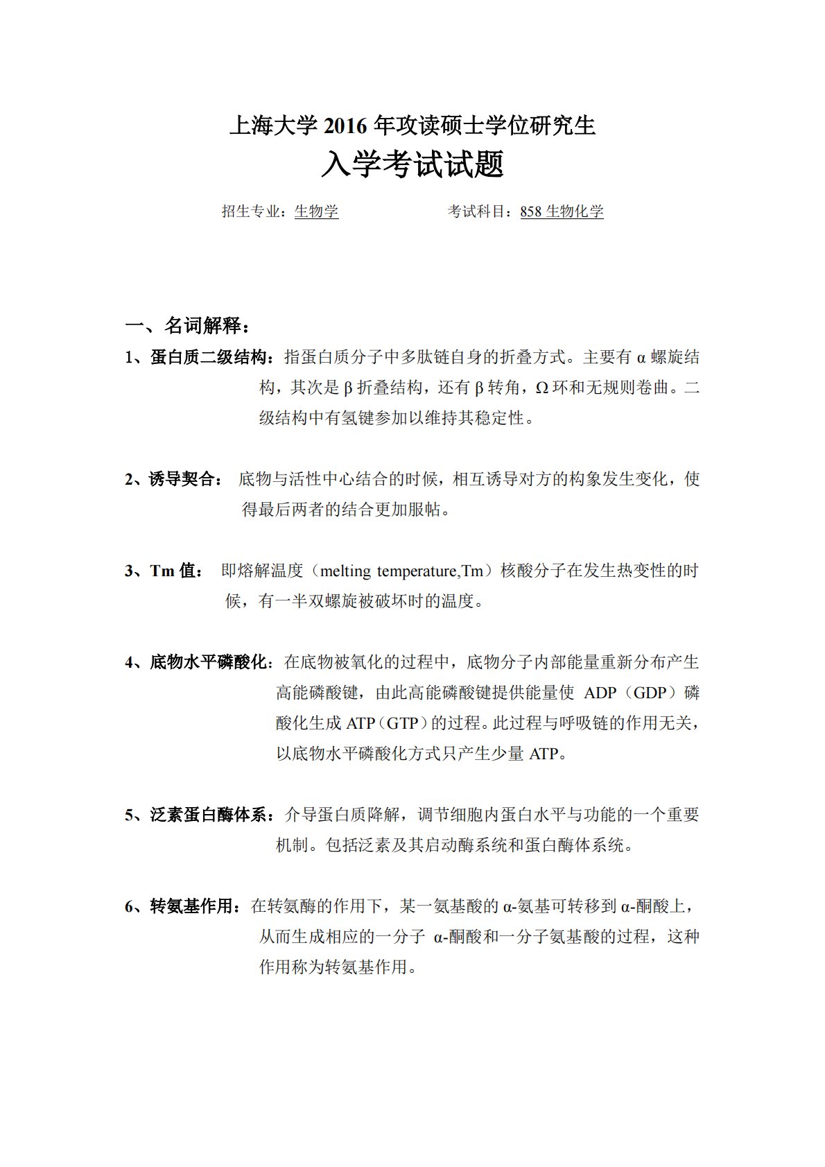 上海大学2016年攻读硕士学位研究生入学考试试题招生专业:生物学考试科目:858生物化学一、名词解释:1、蛋白质二级结构:指蛋白质分子中多肽链自身的折叠方式。主要有α螺旋结构,其次是β折叠结构,还有β转角,Ω环和无规则卷曲。二级结构中有氢键参加以维持其稳定性。2、诱导契合:底物与活性中心结合的时候,相互诱导对方的构象发生变化,使得最后两者的结合更加服帖。3、Tm值:即熔解温度(meltingtemperature,Tm)核酸分子在发生热变性的时候,有一半双螺旋被破坏时的温度。4、底物水平磷酸化:在底物被氧化的过程中,底物分子内部能量重新分布产生高能磷酸键,由此高能磷酸键提供能量使ADP(GDP...