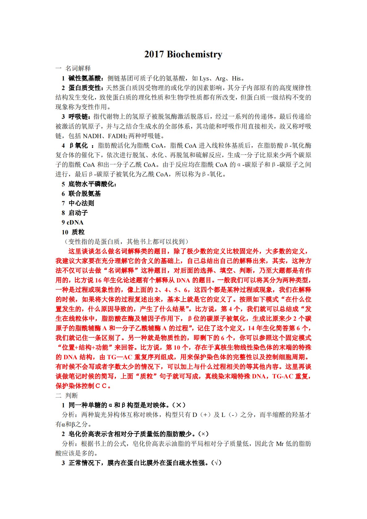 2017Biochemistry一名词解释1碱性氨基酸:侧链基团可质子化的氨基酸,如Lys、Arg、His。2蛋白质变性:天然蛋白质因受物理的或化学的因素影响,其分子内部原有的高度规律性结构发生变化,致使蛋白质的理化性质和生物学性质都有所改变,但蛋白质一级结构不变的现象称为变性作用。3呼吸链:指代谢物上的氢原子被脱氢酶激活脱落后,经过一系列的传递体,最后传递给被激活的氧原子,并与之结合生成水的全部体系,其功能和呼吸作用直接相关,故又称呼吸链,包括NADH、FADH2两种呼吸链。4β氧化:脂肪酸活化为脂酰CoA,脂酰CoA进入线粒体基质后,在脂肪酸β-氧化酶复合体的催化下,依次进行脱氢、水化、再...