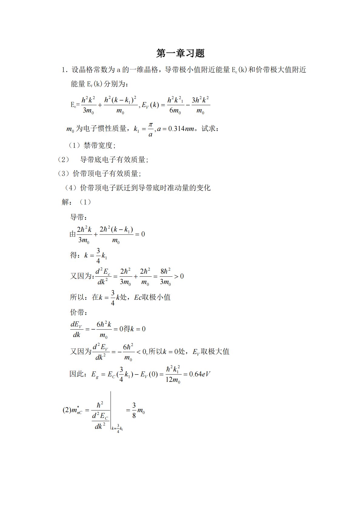 第一章习题1.设晶格常数为a的一维晶格,导带极小值附近能量Ec(k)和价带极大值附近能量EV(k)分别为:Ec=0220122021202236)(,)(3mkhmkhkEmkkhmkhV0m。试求:为电子惯性质量,nmaak314.0,1(1)禁带宽度;(2)导带底电子有效质量;(3)价带顶电子有效质量;(4)价带顶电子跃迁到导带底时准动量的变化解:(1)eVmkEkEEEkmdkEdkmkdkdEEckkmmmdkEdkkmkkmkVCgVVVc64.012)0()43(0,0600643038232430)(2320212102220202020222101202...