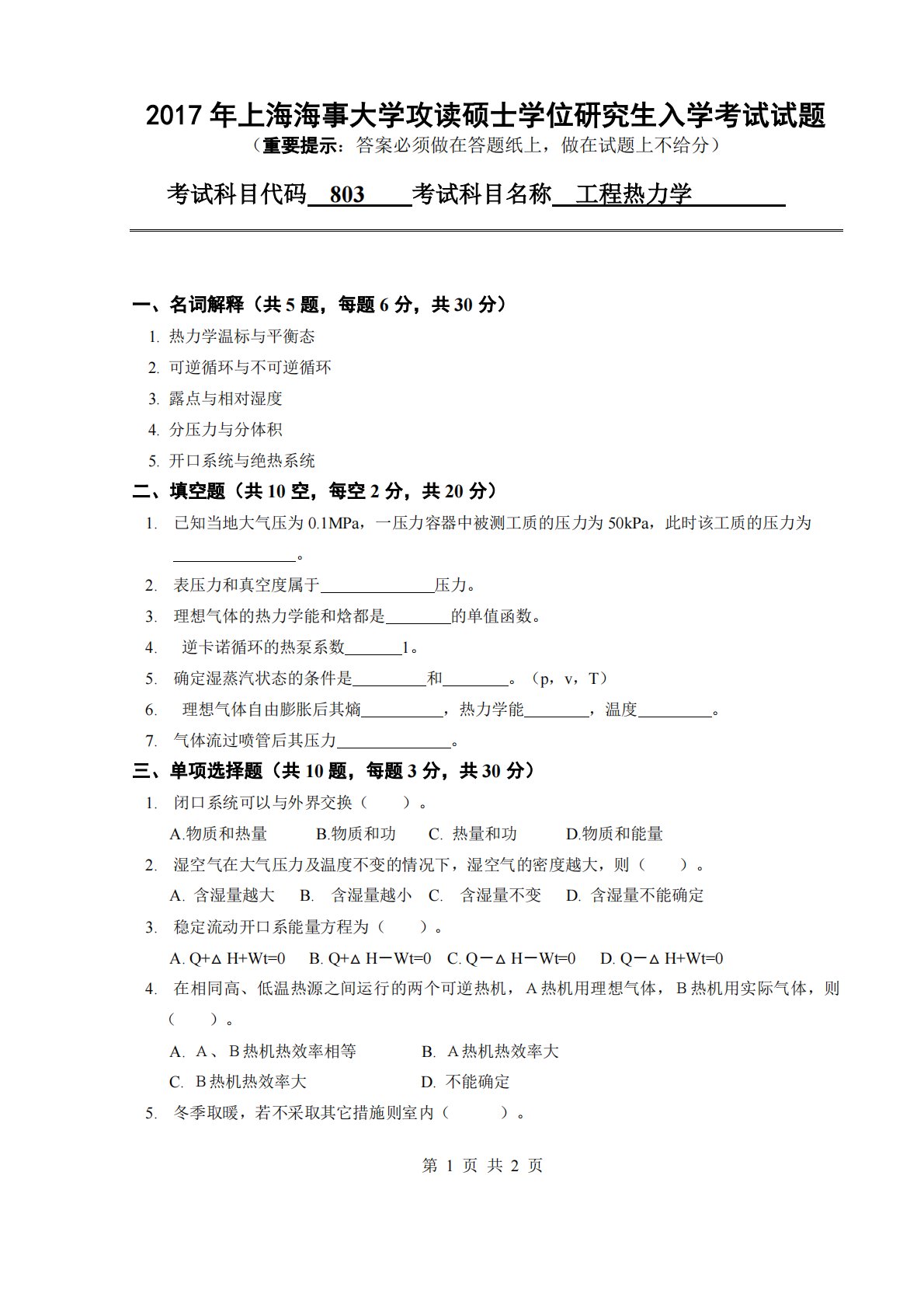 第1页共2页2017年上海海事大学攻读硕士学位研究生入学考试试题(重要提示:答案必须做在答题纸上,做在试题上不给分)考试科目代码803考试科目名称工程热力学一、名词解释(共5题,每题6分,共30分)1.热力学温标与平衡态2.可逆循环与不可逆循环3.露点与相对湿度4.分压力与分体积5.开口系统与绝热系统二、填空题(共10空,每空2分,共20分)1.已知当地大气压为0.1MPa,一压力容器中被测工质的压力为50kPa,此时该工质的压力为。2.表压力和真空度属于压力。3.理想气体的热力学能和焓都是的单值函数。4.逆卡诺循环的热泵系数1。5.确定湿蒸汽状态的条件是和。(p,v,T)6.理想气体自由膨胀...
