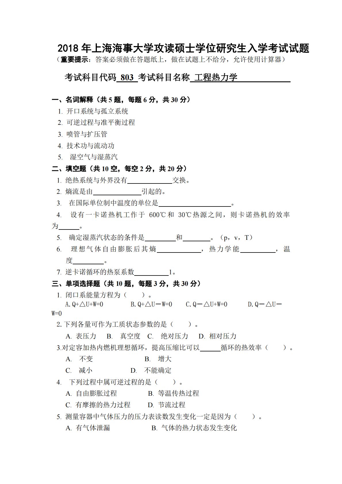2018年上海海事大学攻读硕士学位研究生入学考试试题(重要提示Ö1„xõN«ŠX1„NÈ4è:ÈŠXBNÈ:=56ÈqAè¯+XAÑ1ǘÅ考试科目代码803考试科目名称=工程热力学====================一、名词解释(共5题,每题6分,共30分)1.开口系统与孤立系统2.可逆过程与准平衡过程3.喷管与扩压管4.技术功与流动功5.湿空气与湿蒸汽二、填空题(共10空,每空2分,共20分)1.绝热系统与外界没有交换。2.熵流是由引起的。3.在国际单位制中温度的单位是。4.设有一卡诺热机工作于600℃和30℃热源之间,则卡诺热机的效率为。5.确定湿蒸汽...