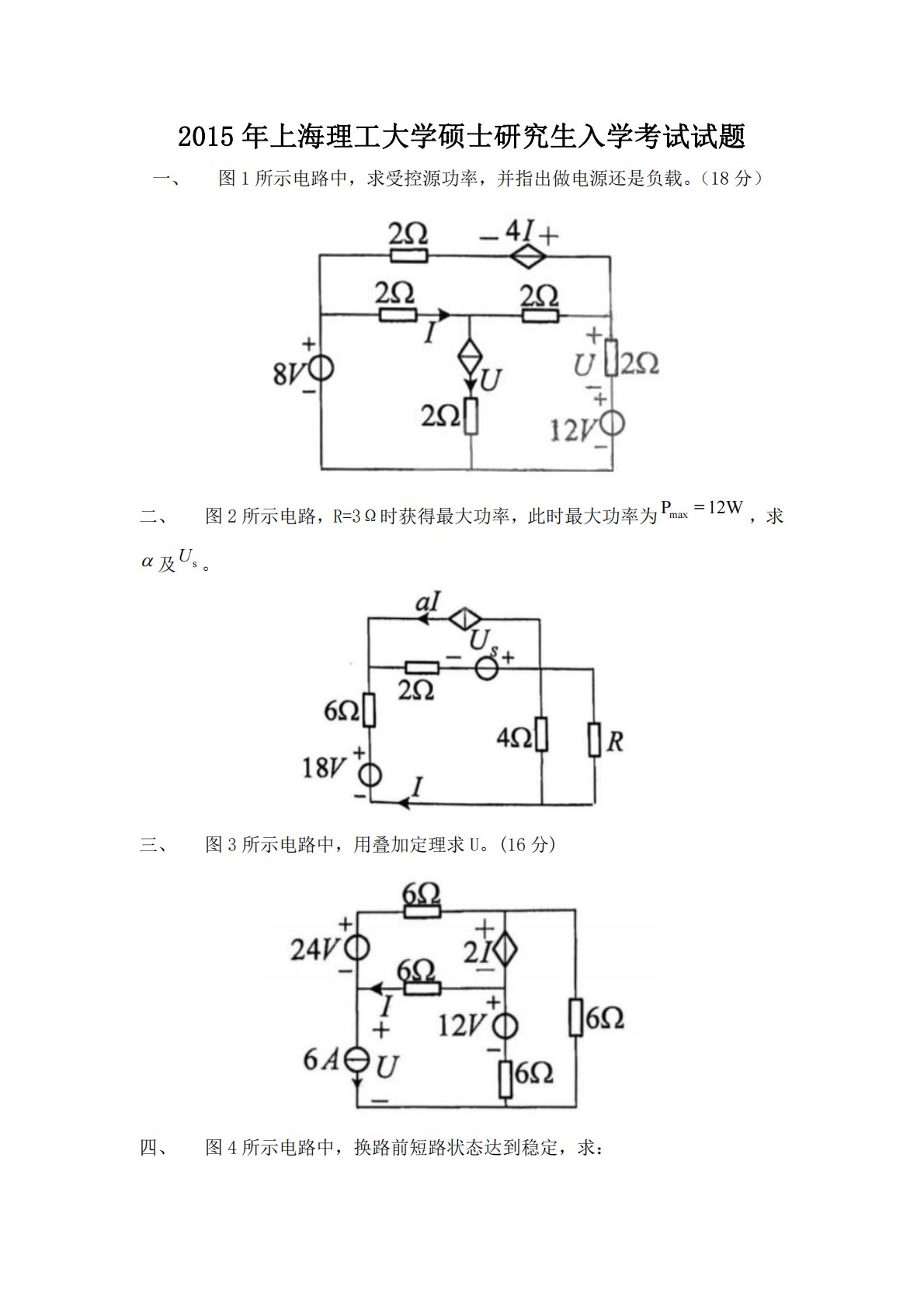 2015年上海理工大学硕士研究生入学考试试题一、图1所示电路中,求受控源功率,并指出做电源还是负载。(18分)二、图2所示电路,R=3Ω时获得最大功率,此时最大功率为maxP=12W,求及sU。三、图3所示电路中,用叠加定理求U。(16分)四、图4所示电路中,换路前短路状态达到稳定,求:(1)用三要素法求(t)i的变化规律(t>0);(2)画出(t)i的波形。(18分)五、换路前电路达到稳定状态,用运算法求(t)i(t>0)。(18分)六、图6所示电路,12===60VUUU,电路的有功功率P=60W,电源频率f=50Hz,求R、L、C的值。(16分)七、图7所示电路中,3=10RΩ,12=...