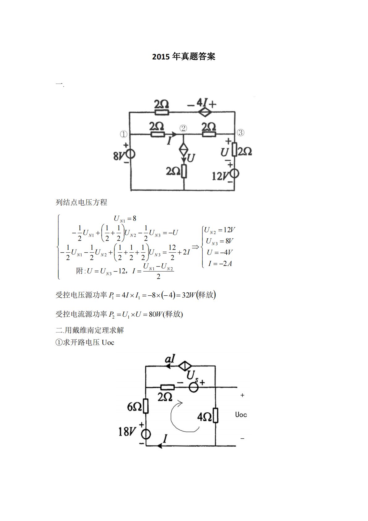 2015年真题答案一.列结点电压方程附,11231233212381212121212121212121222:12212842NNNNNNNNNNNNUUUUUUUUIIUUUUVUVUVUAI=++−−=−+++−−+==−=−==−=−=受控电压源功率=−−==1148432IIPW释放()()受控电流源功率==WUUP释放1280)(二.用戴维南定理求解①求开路电压Uoc②求等效电阻Req当时,=++−=+−−−==++==++==++=eqeq220i40622i4464463418613412MA...