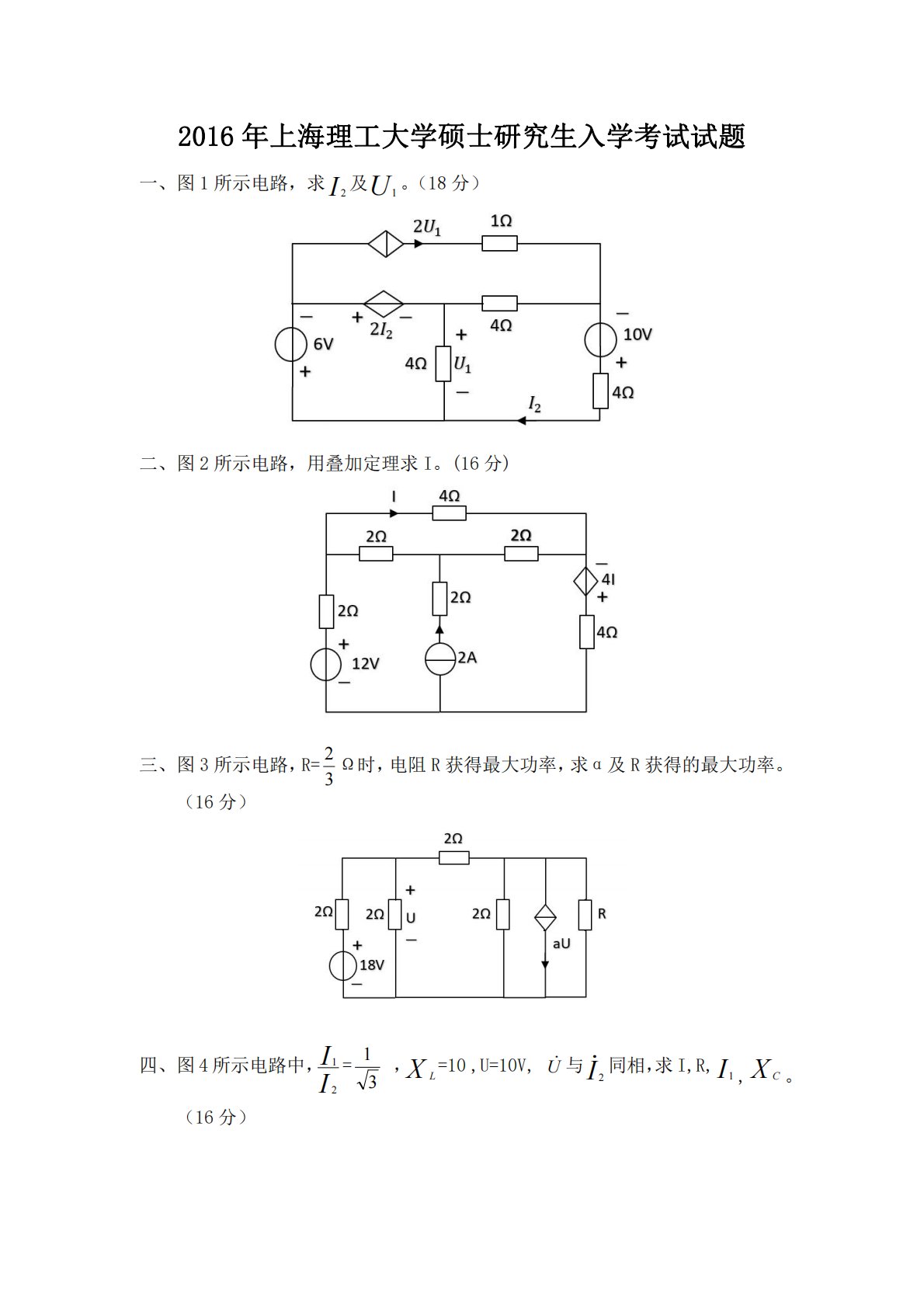 2016年上海理工大学硕士研究生入学考试试题一、图1所示电路,求I2及U1。(18分)二、图2所示电路,用叠加定理求I。(16分)三、图3所示电路,R=32Ω时,电阻R获得最大功率,求α及R获得的最大功率。(16分)四、图4所示电路中,II21=31,XL=10,U=10V,U与I2同相,求I,R,I1,XC。(16分)五、图5所示电路,三相负载总的无功功率为Q=160Var,电源线电压为UL=380V,线电流为=IL10A,求(1)阻抗Z,(2)三相负载总的有功功率,(3)功率表的度数。(16分)六、图6所示电路,换路前电路达到稳定状态,用三要素法)(ti和)(tUc。七、图7所示电路,...