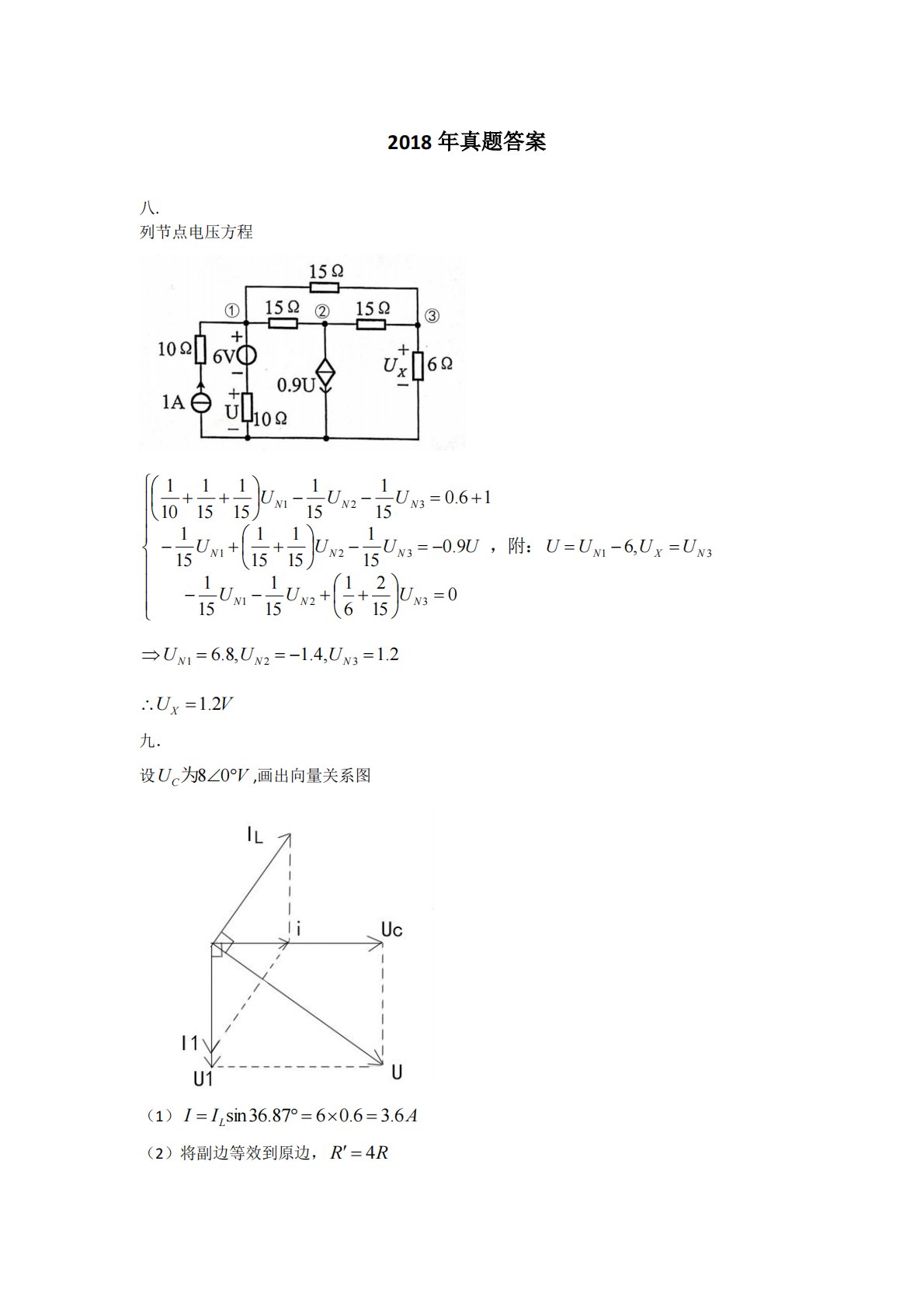 2018年真题答案八.列节点电压方程九.设,画出向量关系图(1)(2)将副边等效到原边,31321321321,60152611511519.015115115115116.0151151151151101NXNNNNNNNNNNUUUUUUUUUUUUUU=−==++−−−=−++−+=−−++,附:2.1,4.1,8.6321=−==NNNUUUVUX2.1=VUC08为AIIL6.36.06.8736sin===RR4=,(3)十.=••==25.187.36cos87.36sinUi11LIUR=3125.0...