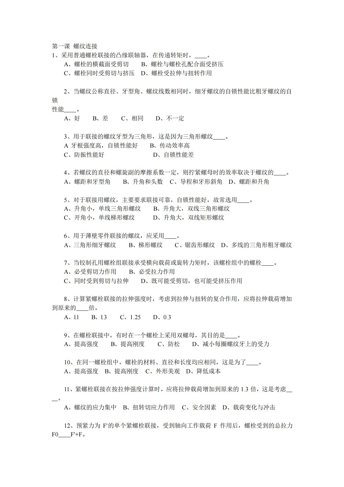 第一课螺纹连接1、采用普通螺栓联接的凸缘联轴器,在传递转矩时,__。A、螺栓的横截面受剪切B、螺栓与螺栓孔配合面受挤压C、螺栓同时受剪切与挤压D、螺栓受拉伸与扭转作用2、当螺纹公称直径、牙型角、螺纹线数相同时,细牙螺纹的自锁性能比粗牙螺纹的自锁性能__。A、好B、差C、相同D、不一定3、用于联接的螺纹牙型为三角形,这是因为三角形螺纹__。A牙根强度高,自锁性能好B、传动效率高C、防振性能好D、自锁性能差4、若螺纹的直径和螺旋副的摩擦系数一定,则拧紧螺母时的效率取决于螺纹的__。A、螺距和牙型角B、升角和头数C、导程和牙形斜角D、螺距和升角5、对于联接用螺纹,主要要求联接可靠,自锁性能好,故常选...