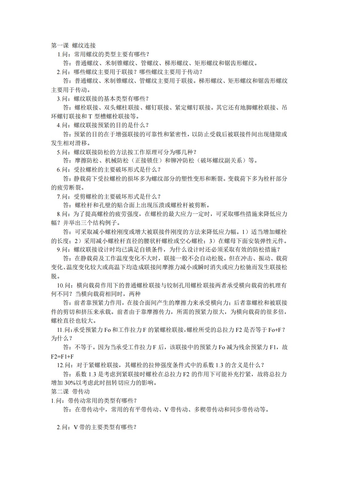 第一课螺纹连接1.问:常用螺纹的类型主要有哪些?答:普通螺纹、米制锥螺纹、管螺纹、梯形螺纹、矩形螺纹和锯齿形螺纹。2.问:哪些螺纹主要用于联接?哪些螺纹主要用于传动?答:普通螺纹、米制锥螺纹、管螺纹主要用于联接。梯形螺纹、矩形螺纹和锯齿形螺纹主要用于传动。3.问:螺纹联接的基本类型有哪些?答:螺栓联接、双头螺柱联接、螺钉联接、紧定螺钉联接。其它还有地脚螺栓联接、吊环螺钉联接和T型槽螺栓联接等。4.问:螺纹联接预紧的目的是什么?答:预紧的目的在于增强联接的可靠性和紧密性,以防止受载后被联接件间出现缝隙或发生相对滑移。5.问:螺纹联接防松的方法按工作原理可分为哪几种?答:摩擦防松、机械防松(正接锁...