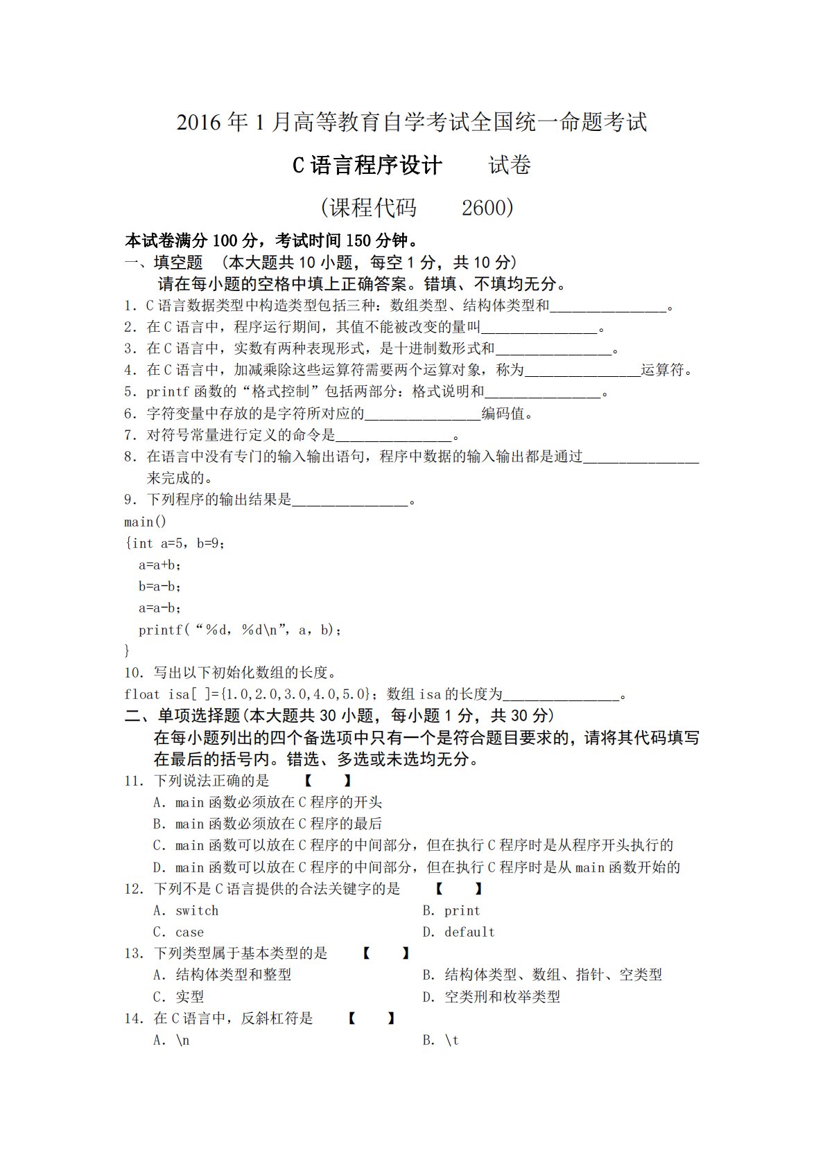 2016年1月高等教育自学考试全国统一命题考试C语言程序设计试卷(课程代码2600)本试卷满分100分,考试时间l50分钟。一、填空题(本大题共10小题,每空1分,共10分)请在每小题的空格中填上正确答案。错填、不填均无分。1.C语言数据类型中构造类型包括三种:数组类型、结构体类型和________________。2.在C语言中,程序运行期间,其值不能被改变的量叫________________。3.在C语言中,实数有两种表现形式,是十进制数形式和________________。4.在C语言中,加减乘除这些运算符需要两个运算对象,称为________________运算符。5.printf...