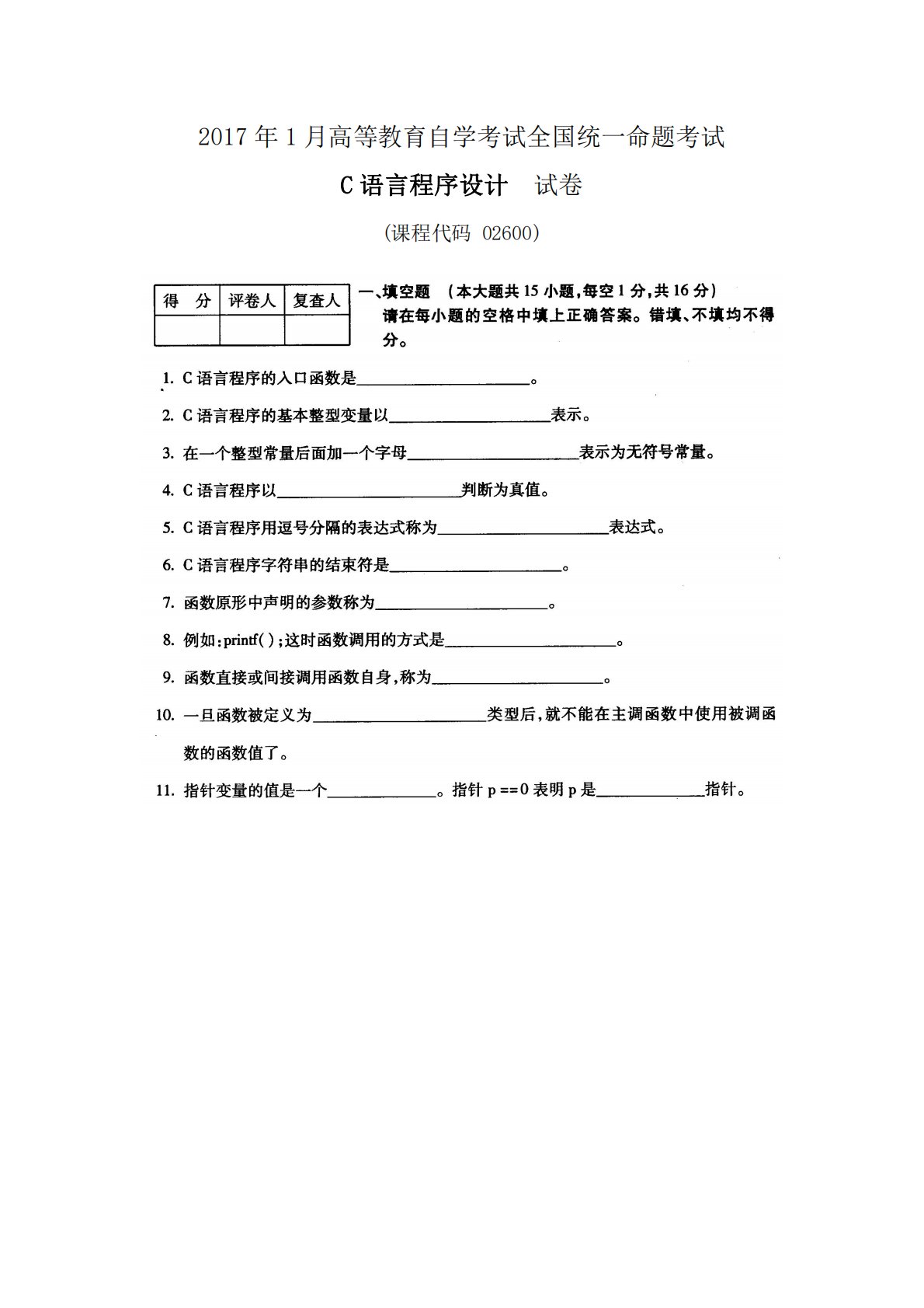 2017年1月高等教育自学考试全国统一命题考试C语言程序设计试卷(课程代码02600)百校文库—海量高校资料共享库百校文库是一个线上大学生专业学习资料共享平台,致力于通过用户自主上传与分享,打造一个涵盖各大高校、各学科门类的免费资源中心。平台已积累50万+套历年真题与100万+条学习文档,覆盖绝大多数高校专业,所有资料均由各大高校学生自主上传。✅资料透明,直观预览新增全站资料目录功能,所有资源分类清晰、一目了然。访问在线目录,即可快速浏览平台资源全貌,了解资料覆盖范围。点击查看实时更新的资源总览:【百校文库最新资料目录】✅严格审核,保障基础质量为确保内容可用性,所有用户上传资料均经过基础格式与...