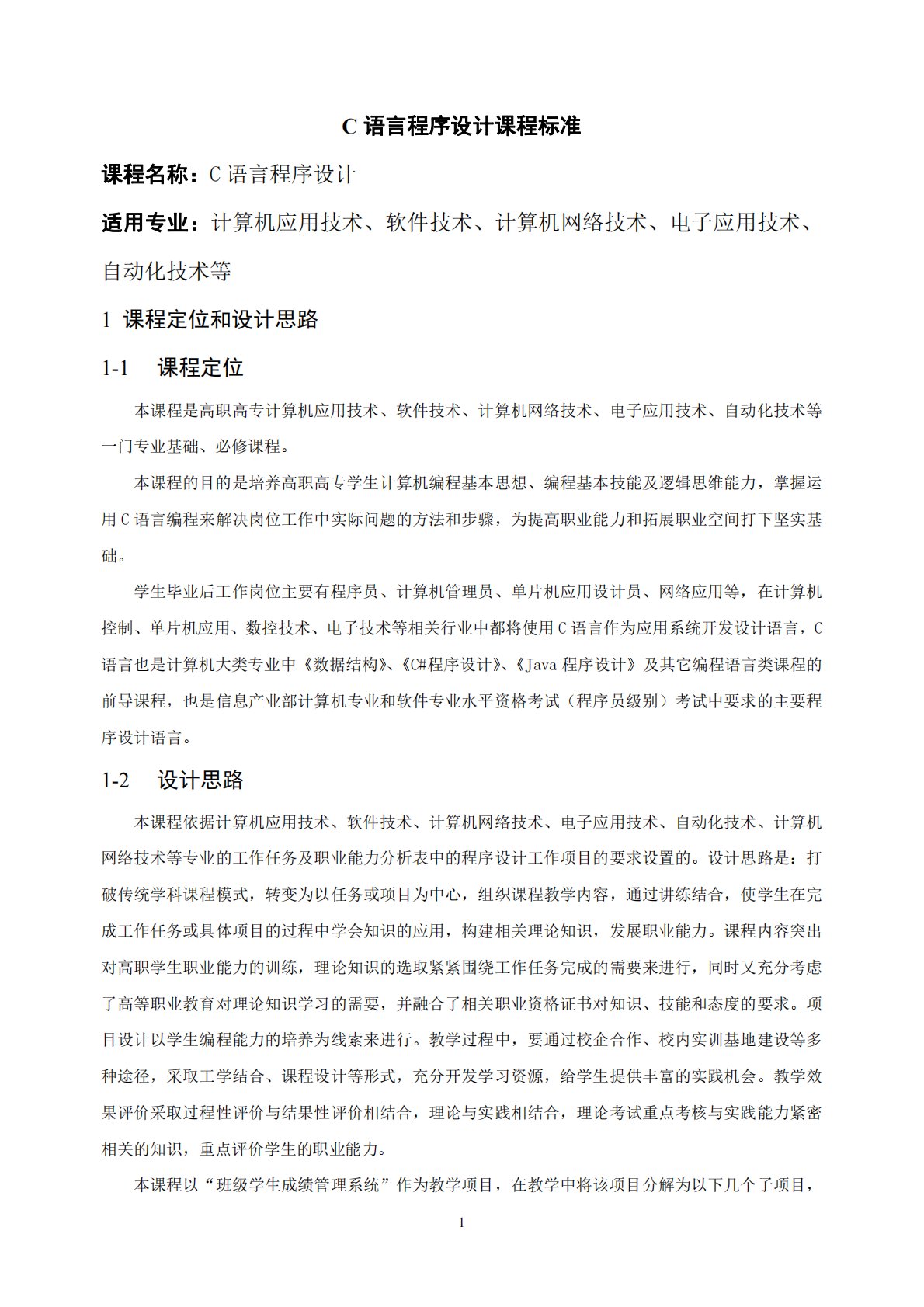 1C语言程序设计课程标准课程名称:C语言程序设计适用专业:计算机应用技术、软件技术、计算机网络技术、电子应用技术、自动化技术等1课程定位和设计思路1-1课程定位本课程是高职高专计算机应用技术、软件技术、计算机网络技术、电子应用技术、自动化技术等一门专业基础、必修课程。本课程的目的是培养高职高专学生计算机编程基本思想、编程基本技能及逻辑思维能力,掌握运用C语言编程来解决岗位工作中实际问题的方法和步骤,为提高职业能力和拓展职业空间打下坚实基础。学生毕业后工作岗位主要有程序员、计算机管理员、单片机应用设计员、网络应用等,在计算机控制、单片机应用、数控技术、电子技术等相关行业中都将使用C语言作为应用系...