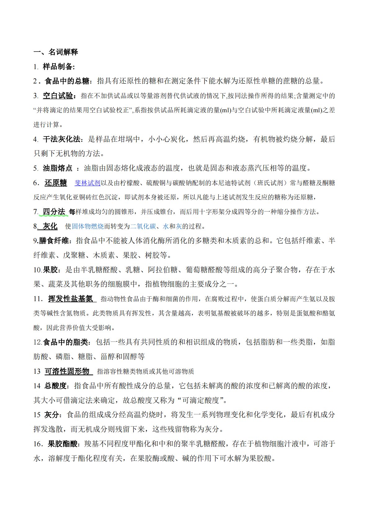 一、名词解释1.样品制备:2.食品中的总糖:指具有还原性的糖和在测定条件下能水解为还原性单糖的蔗糖的总量。3.空白试验:指在不加供试品或以等量溶剂替代供试液的情况下,按同法操作所得的结果;含量测定中的“并将滴定的结果用空白试验校正”,系指按供试品所耗滴定液的量(ml)与空白试验中所耗滴定液量(ml)之差进行计算。4.干法灰化法:是样品在坩埚中,小小心炭化,然后再高温灼烧,有机物被灼烧分解,最后只剩下无机物的方法。5.油脂熔点:油脂由固态熔化成液态的温度,也就是固态和液态蒸汽压相等的温度。6.还原糖斐林试剂以及由柠檬酸、硫酸铜与碳酸钠配制的本尼迪特试剂(班氏试剂)常与醛糖及酮糖反应产生氧化亚铜砖...