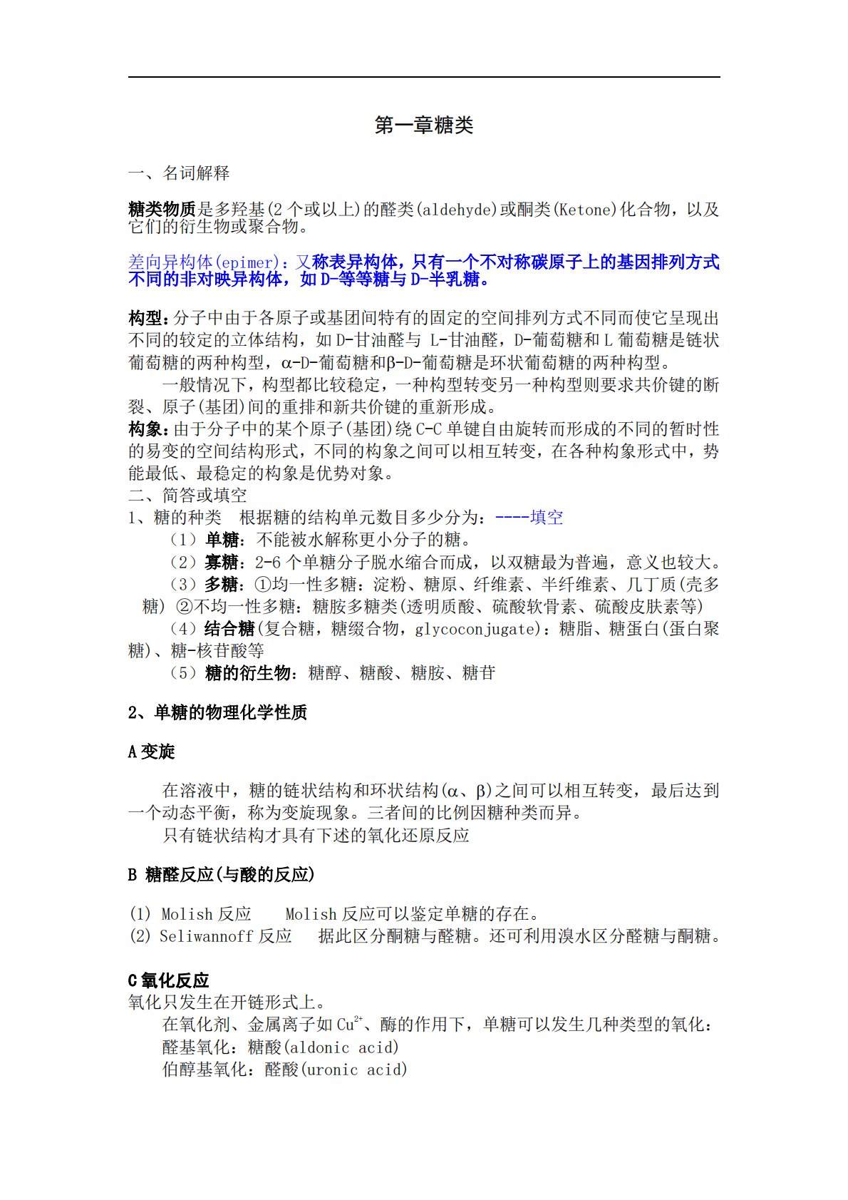 第一章糖类一、名词解释糖类物质是多羟基(2个或以上)的醛类(aldehyde)或酮类(Ketone)化合物,以及它们的衍生物或聚合物。差向异构体(epimer):又称表异构体,只有一个不对称碳原子上的基因排列方式不同的非对映异构体,如D-等等糖与D-半乳糖。构型:分子中由于各原子或基团间特有的固定的空间排列方式不同而使它呈现出不同的较定的立体结构,如D-甘油醛与L-甘油醛,D-葡萄糖和L葡萄糖是链状葡萄糖的两种构型,-D-葡萄糖和-D-葡萄糖是环状葡萄糖的两种构型。一般情况下,构型都比较稳定,一种构型转变另一种构型则要求共价键的断裂、原子(基团)间的重排和新共价键的重新形成。构象:由于分子...