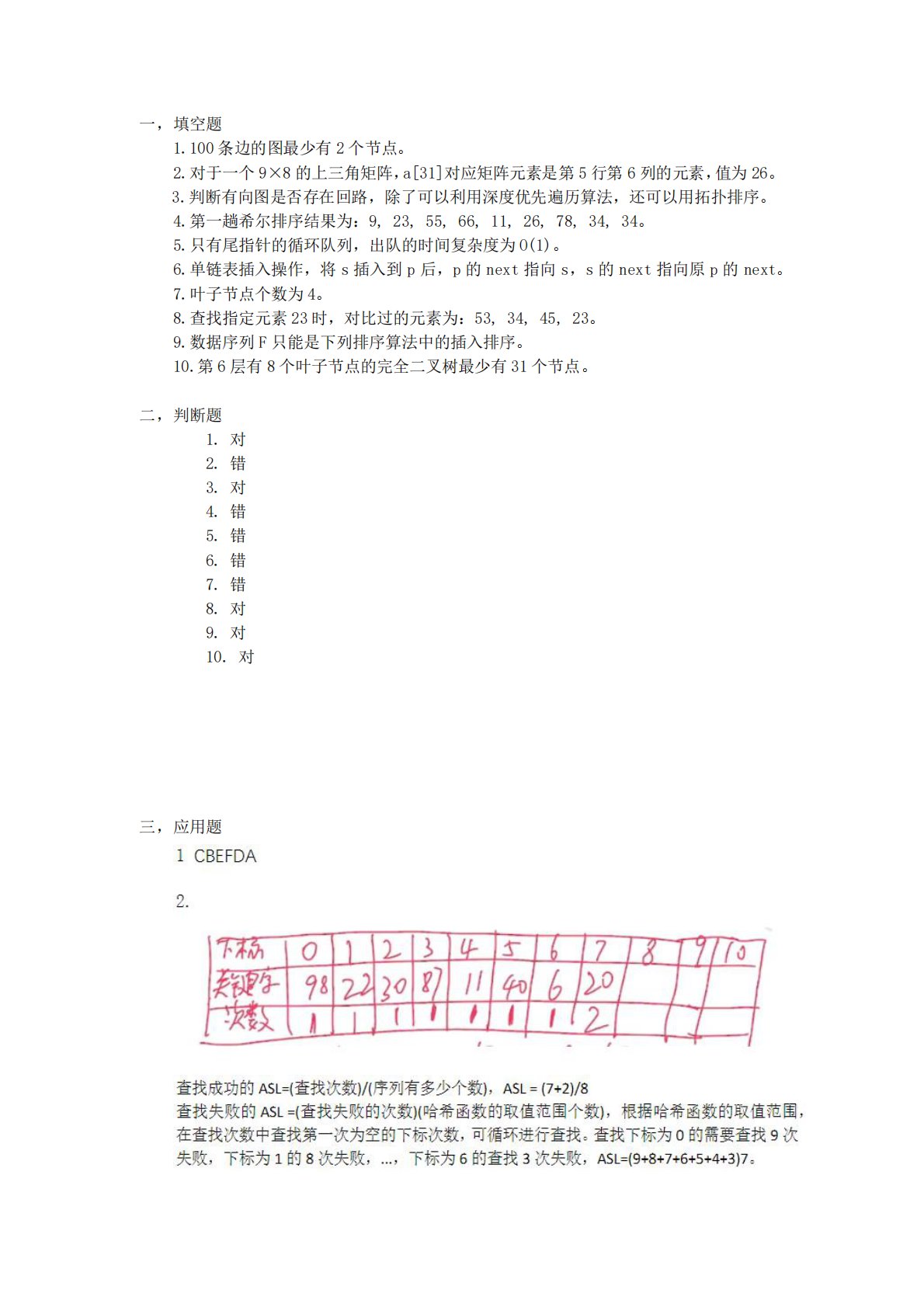 一,填空题1.100条边的图最少有2个节点。2.对于一个9×8的上三角矩阵,a[31]对应矩阵元素是第5行第6列的元素,值为26。3.判断有向图是否存在回路,除了可以利用深度优先遍历算法,还可以用拓扑排序。4.第一趟希尔排序结果为:9,23,55,66,11,26,78,34,34。5.只有尾指针的循环队列,出队的时间复杂度为O(1)。6.单链表插入操作,将s插入到p后,p的next指向s,s的next指向原p的next。7.叶子节点个数为4。8.查找指定元素23时,对比过的元素为:53,34,45,23。9.数据序列F只能是下列排序算法中的插入排序。10.第6层有8个叶子节点的完全二叉树最少...