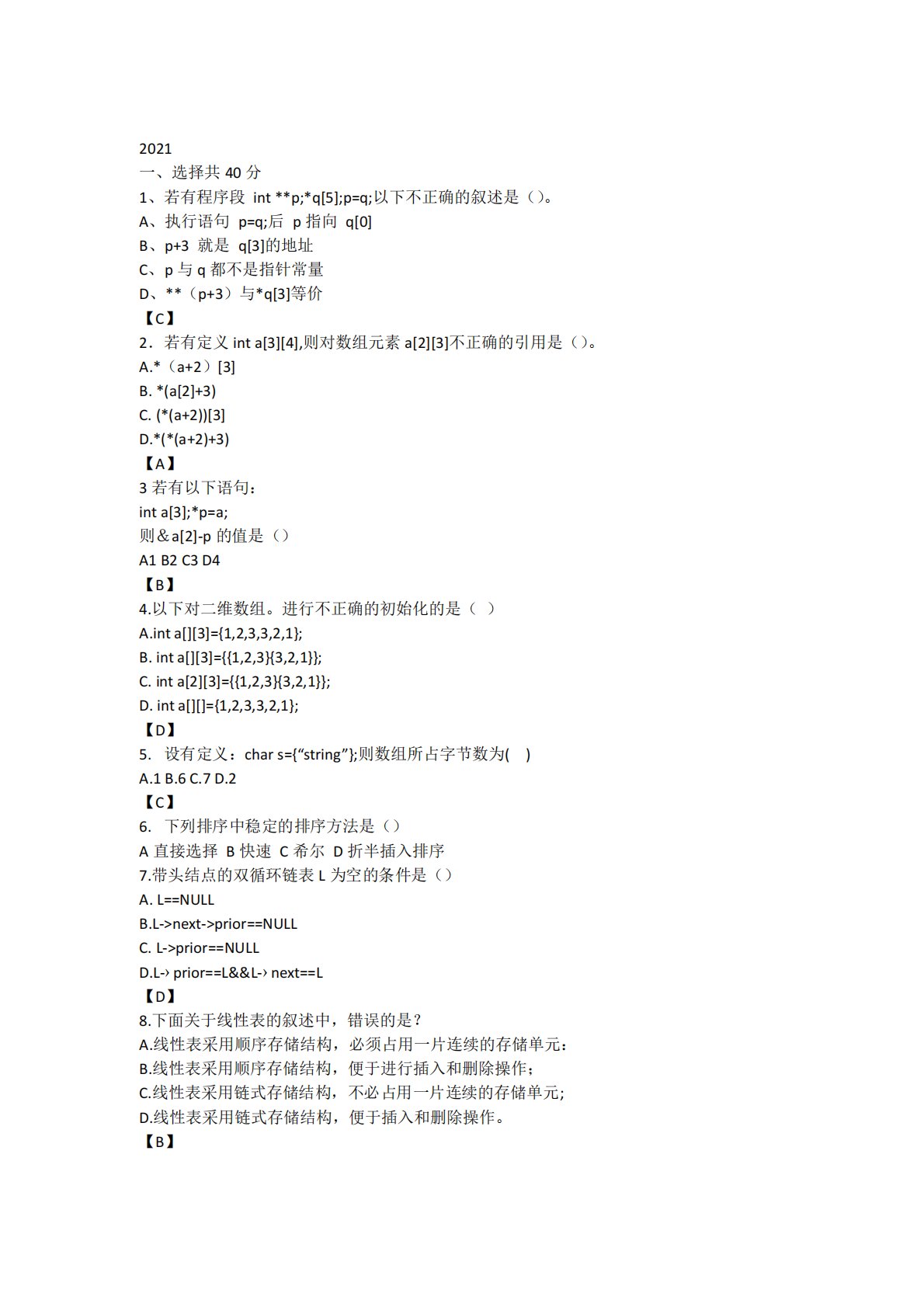 2021一、选择共40分1、若有程序段int**p;*q[5];p=q;以下不正确的叙述是()。A、执行语句p=q;后p指向q[0]B、p+3就是q[3]的地址C、p与q都不是指针常量D、**(p+3)与*q[3]等价【C】2.若有定义inta[3][4],则对数组元素a[2][3]不正确的引用是()。A.*(a+2)[3]B.*(a[2]+3)C.(*(a+2))[3]D.*(*(a+2)+3)【A】3若有以下语句:inta[3];*p=a;则&a[2]-p的值是()A1B2C3D4【B】4.以下对二维数组。进行不正确的初始化的是()A.inta[][3]={1,2,3,3,2,1};B.i...