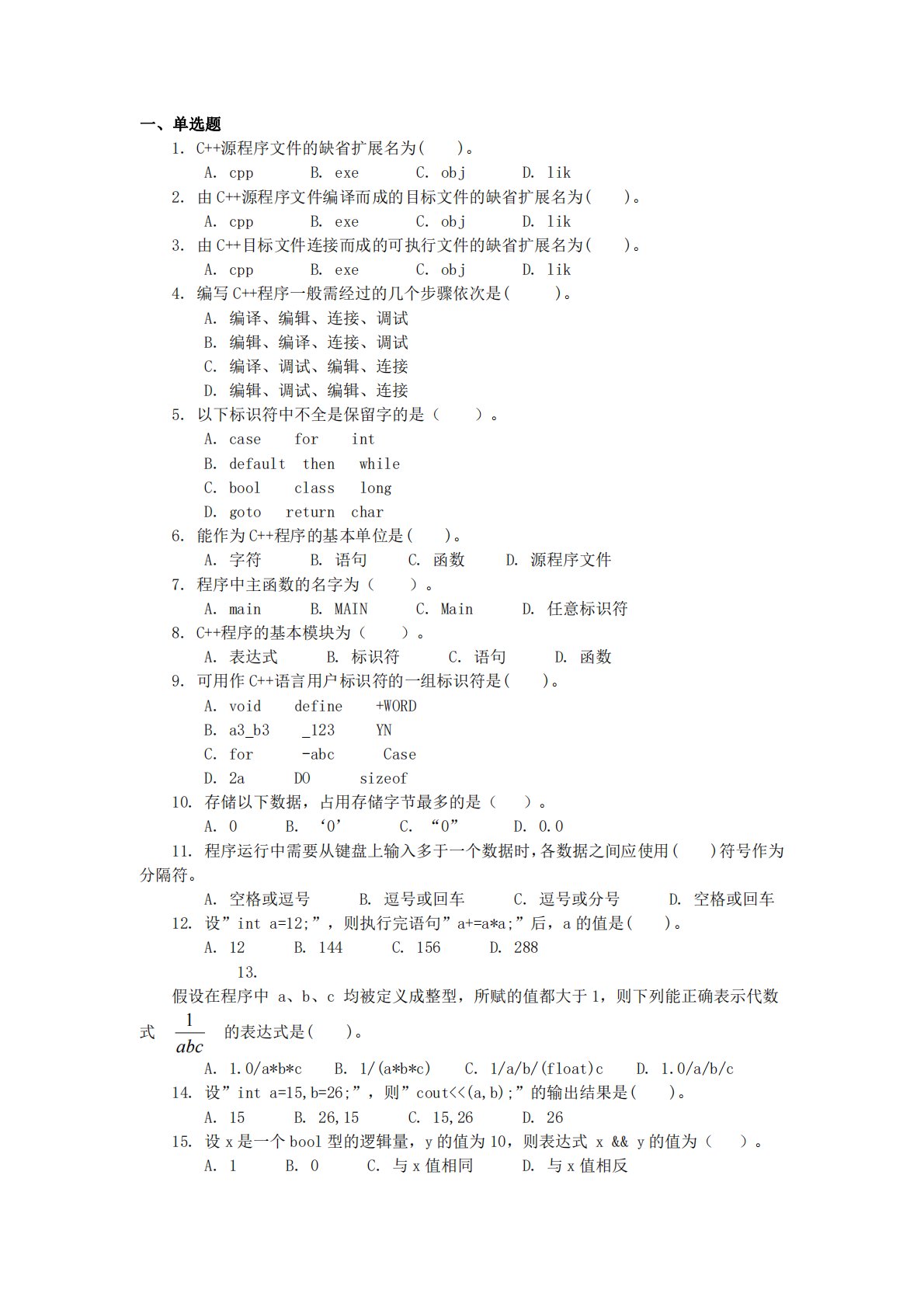 一、单选题1.C++源程序文件的缺省扩展名为()。A.cppB.exeC.objD.lik2.由C++源程序文件编译而成的目标文件的缺省扩展名为()。A.cppB.exeC.objD.lik3.由C++目标文件连接而成的可执行文件的缺省扩展名为()。A.cppB.exeC.objD.lik4.编写C++程序一般需经过的几个步骤依次是()。A.编译、编辑、连接、调试B.编辑、编译、连接、调试C.编译、调试、编辑、连接D.编辑、调试、编辑、连接5.以下标识符中不全是保留字的是()。A.caseforintB.defaultthenwhileC.boolclasslongD.gotoreturnch...