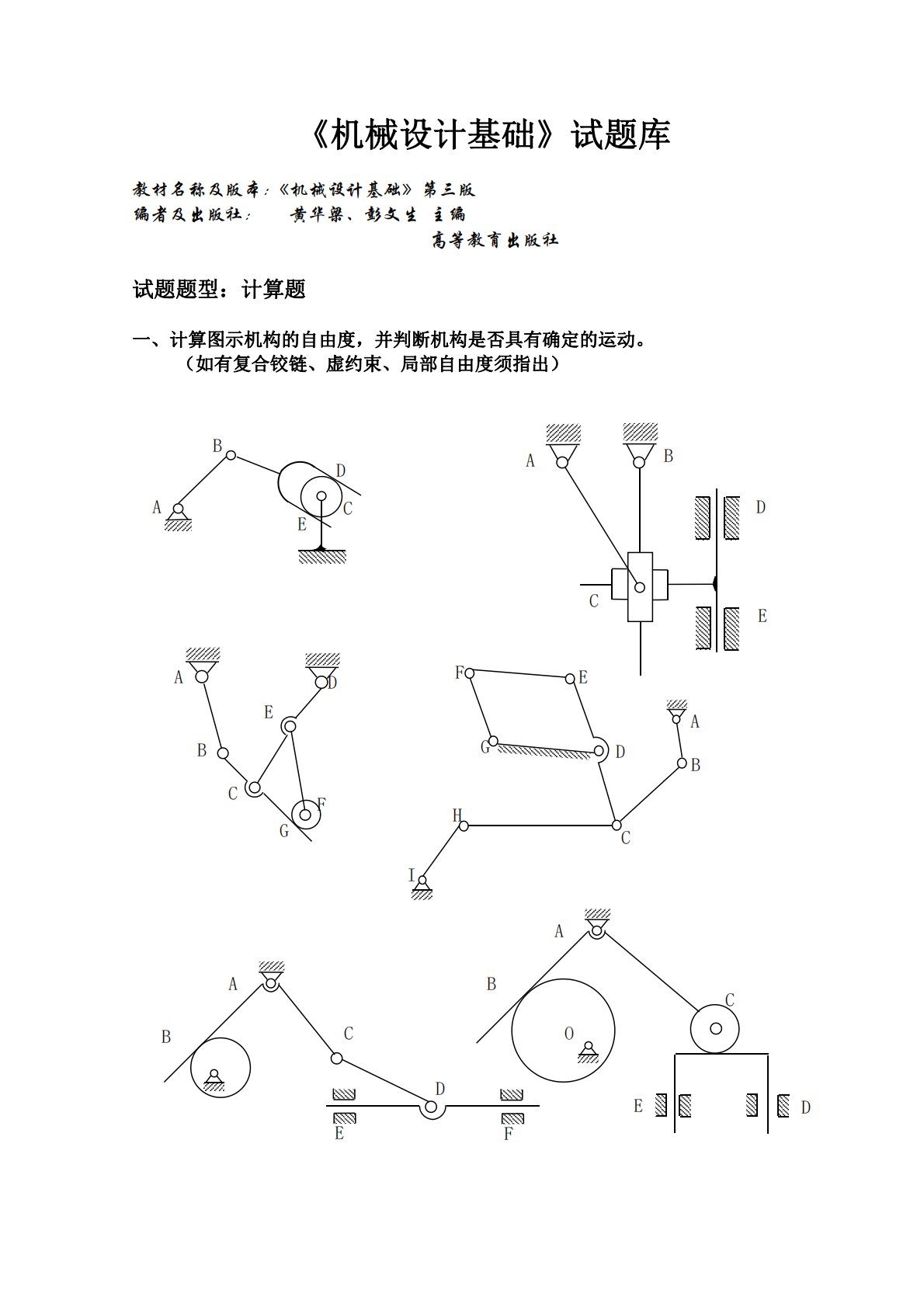 《机械设计基础》试题库教材名称及版本:《机械设计基础》第三版编者及出版社:黄华梁、彭文生主编高等教育出版社试题题型:计算题一、计算图示机构的自由度,并判断机构是否具有确定的运动。(如有复合铰链、虚约束、局部自由度须指出)ABCDEABDCEABCDEFGABCDEFGHIABCDEFABCDOEABCDEFEAGOFBCDOABCDEFGHKEAGOFBCDABCDEFOABCDEFGOHABCDAOBCDEFABCDOABCODEBCADEFGHIOAOCBHDGIFE二、轮系的计算1.在图示轮系中,已知各轮齿数为Z1=Z3=30,Z2=90,Z2’=40,Z3’=40,Z4=30,试求传动...