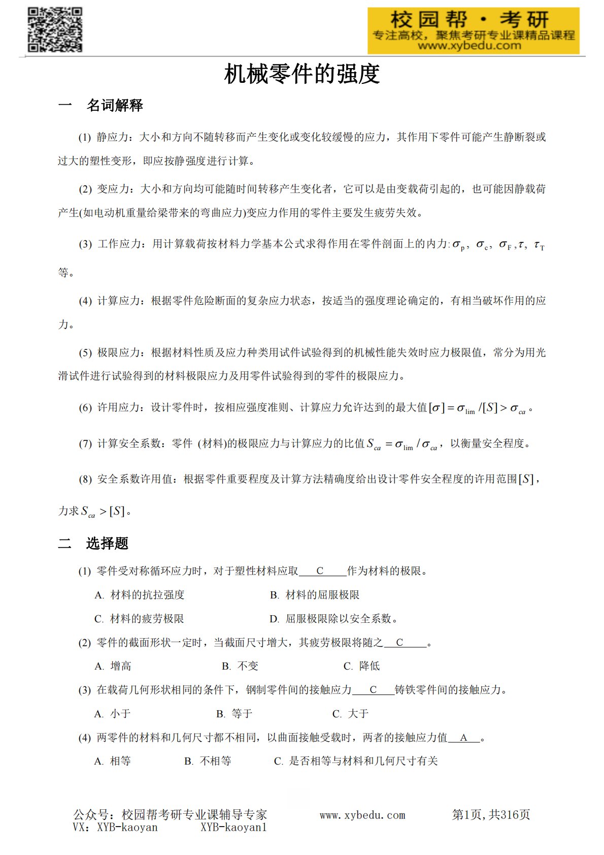 机械零件的强度一名词解释(1)静应力:大小和方向不随转移而产生变化或变化较缓慢的应力,其作用下零件可能产生静断裂或过大的塑性变形,即应按静强度进行计算。(2)变应力:大小和方向均可能随时间转移产生变化者,它可以是由变载荷引起的,也可能因静载荷产生(如电动机重量给梁带来的弯曲应力)变应力作用的零件主要发生疲劳失效。(3)工作应力:用计算载荷按材料力学基本公式求得作用在零件剖面上的内力:Fcp,, ,T,等。(4)计算应力:根据零件危险断面的复杂应力状态,按适当的强度理论确定的,有相当破坏作用的应力。(5)极限应力:根据材料性质及应力种类用试件试验得到的机械性能失效时应力极限值,常分为用...