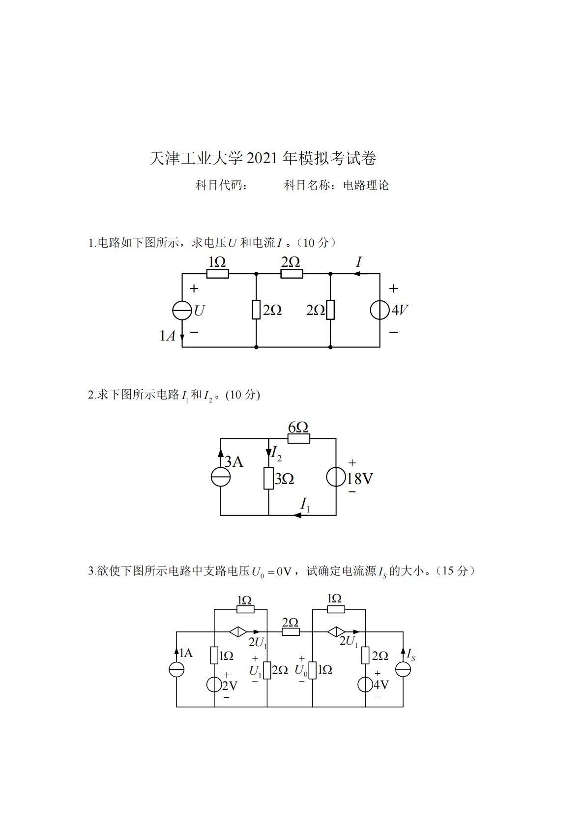 天津工业大学2021年模拟考试卷科目代码:科目名称:电路理论1.电路如下图所示,求电压U和电流I。(10分)1Ω2Ω2Ω2Ω4VIU1A2.求下图所示电路I1和I2。(10分)+−3A3Ω6Ω18V1II23.欲使下图所示电路中支路电压U0=0V,试确定电流源IS的大小。(15分)+−+−+−+−1A1Ω1Ω1Ω1Ω2Ω2Ω2V4VU12U12U12ΩU0IS6.4.电路如图所示,用节点电压法求电压及受控源发出的功率。(15分)5.电路如下图所示,求电流及1A电流源发出的功率。(15分)电路如下图所示,求电流和电流源发出的功率。(15分)U15V+−U+−3Ω3Ω3Ωba13U4Ω2Ωc1A,...