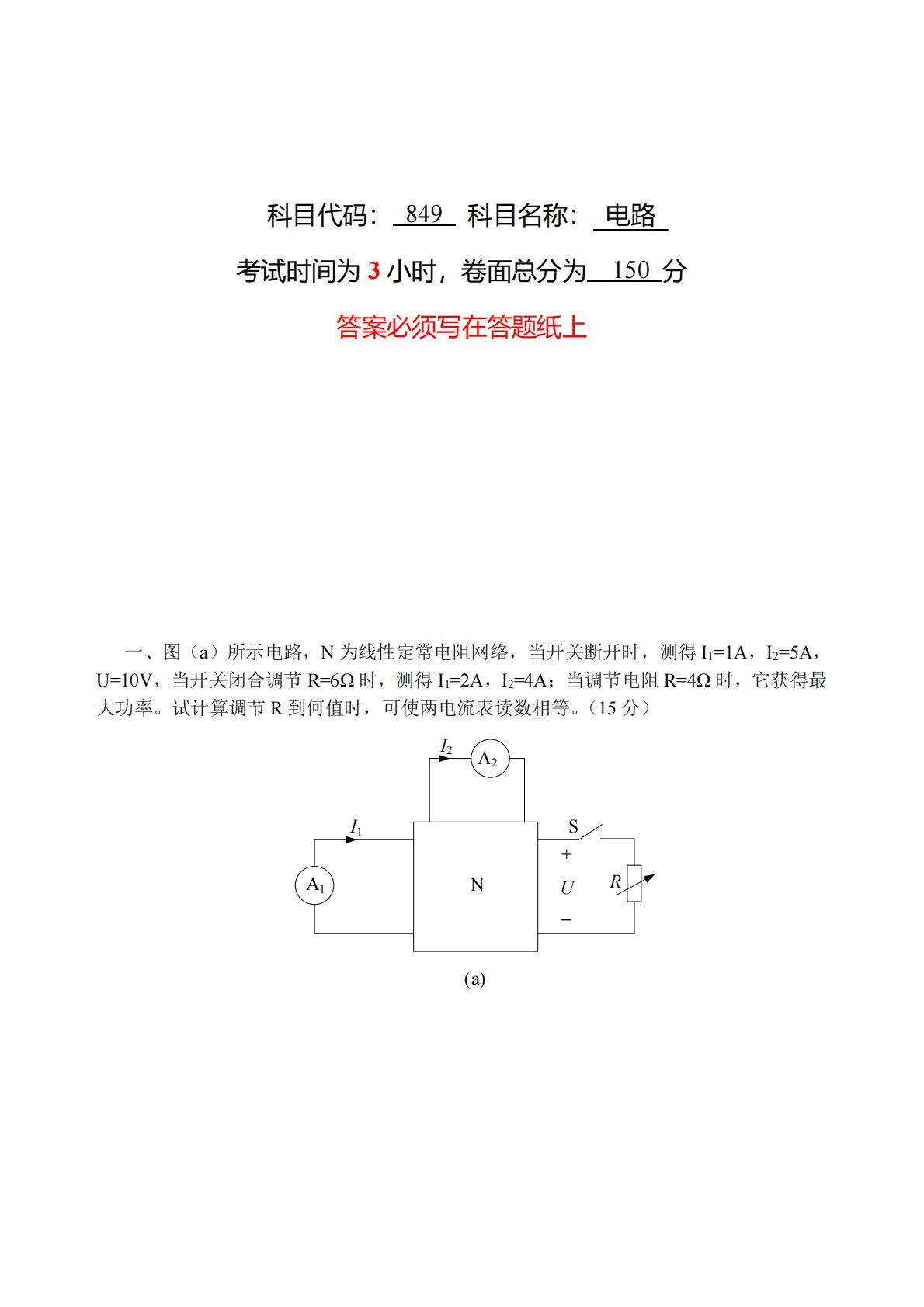 科目代码:849科目名称:电路考试时间为3小时,卷面总分为150分答案必须写在答题纸上一、图(a)所示电路,N为线性定常电阻网络,当开关断开时,测得I1=1A,I2=5A,U=10V,当开关闭合调节R=6Ω时,测得I1=2A,I2=4A;当调节电阻R=4Ω时,它获得最大功率。试计算调节R到何值时,可使两电流表读数相等。(15分)A1A2NI1I2SRU+_(a)二、电路如图所示,试求电压U。(15分)i2Ω28V+−2i4Ω1iU+−6Ω三、对如图所示电路,用节点法求1I、2I、3I及受控源吸收的功率。(15分)3Ω2Ω1U5Ω4Ω2Ω2I4V+−3IU+−10V+−3U2U1I3A34I4Ω...