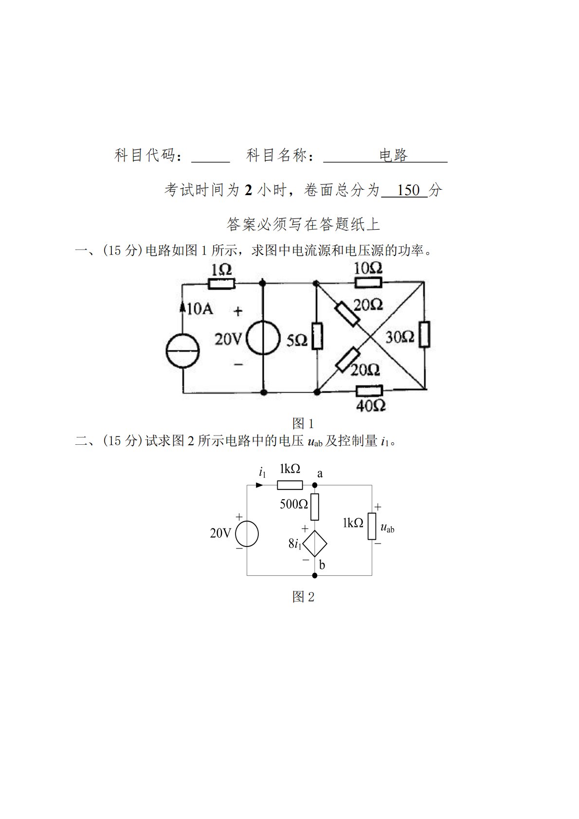 科目代码:科目名称:电路考试时间为2小时,卷面总分为150分答案必须写在答题纸上一、(15分)电路如图1所示,求图中电流源和电压源的功率。图1二、(15分)试求图2所示电路中的电压uab及控制量i1。图2三、(15分)下图所示直流电路,各参数如图中标注。试用结点法求电压1u、2u。图3四、(15分)下图所示电路中各参数已给定,试求受控源的功率。图4五、(15分)图5所示电路中,已知US1=US2=10V,US3=US4=US5=15V,求各电源的功率,并说明功率是提供的还是吸收的?i1图5六、(15分)求图6所示电路中的电流I。图6七、(15分)求图7(a)和(b)两个单口电路的等效电阻。图中...