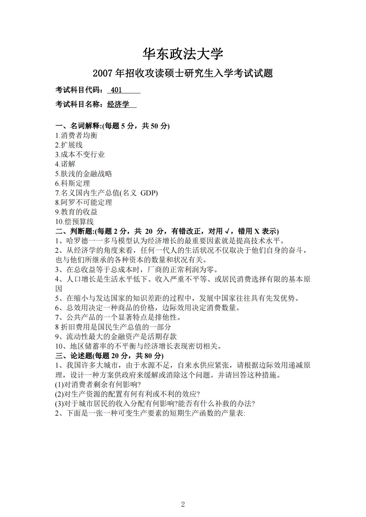 华东政法大学2007年招收攻读硕士研究生入学考试试题考试科目代码:401考试科目名称:经济学一、名词解释:(每题5分,共50分)1.消费者均衡2.扩展线3.成本不变行业4.诺解5.肤浅的金融战略6.科斯定理7.名义国内生产总值(名义GDP)8.阿罗不可能定理9.教育的收益10.偿预算线二、判断题:(每题2分,共20分,有错改正,对用√,错用X表示)1、哈罗德一一多马模型认为经济增长的最重要因素就是提高技术水平。2、从经济学的角度来看,任何一代人的生活状况不仅取决于他们自身的奋斗,也与他们所继承的各种资本的数量和状况有关。3、在总收益等于总成本时,厂商的正常利润为零。4、人口增长是生活水平低下、...