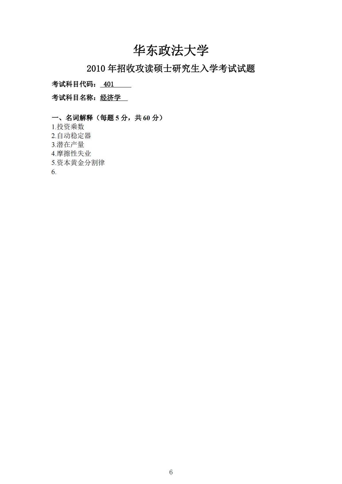 华东政法大学2010年招收攻读硕士研究生入学考试试题考试科目代码:401考试科目名称:经济学一、名词解释(每题5分,共60分)1.投资乘数2.自动稳定器3.潜在产量4.摩擦性失业5.资本黄金分割律6.6华东政法大学2010年招收攻读硕士研究生入学考试试题考试科目代码:401考试科目名称:经济学一、名词解释(每题5分,共60分)1.投资乘数2.自动稳定器3.潜在产量4.摩擦性失业5.资本黄金分割律6.货币幻觉7.购买力平价8.平衡预算乘数9.比较优势10.汇率二、简答题(每题10分,共40分)1、简述“流动性偏好陷阱”的基本原理。2、储蓄-投资恒等式为什么不意味着计划的储蓄等于计划的投资。3、什...
