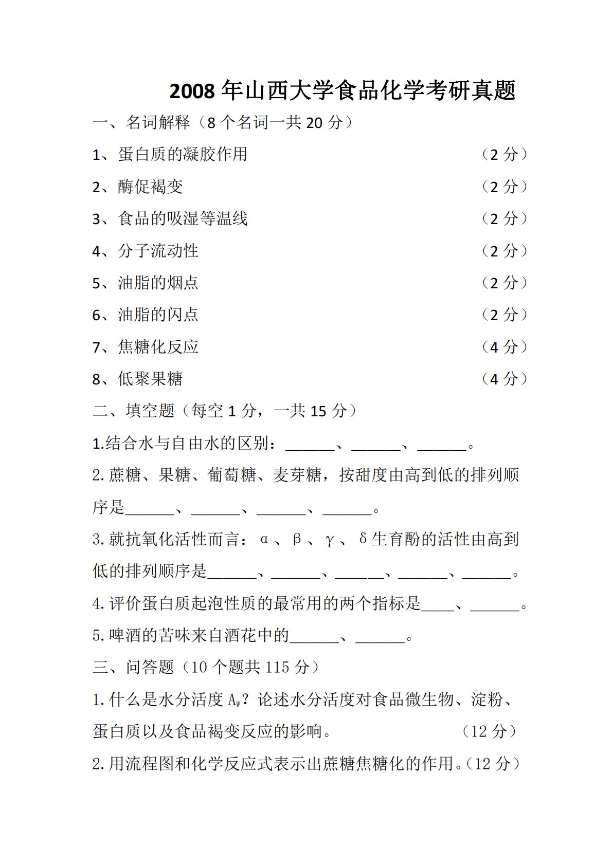 2008年山西大学食品化学考研真题一、名词解释(8个名词一共20分)1、蛋白质的凝胶作用(2分)2、酶促褐变(2分)3、食品的吸湿等温线(2分)4、分子流动性(2分)5、油脂的烟点(2分)6、油脂的闪点(2分)7、焦糖化反应(4分)8、低聚果糖(4分)二、填空题(每空1分,一共15分)1.结合水与自由水的区别:___、___、___。2.蔗糖、果糖、葡萄糖、麦芽糖,按甜度由高到低的排列顺序是___、___、___、___。3.就抗氧化活性而言:α、β、γ、δ生育酚的活性由高到低的排列顺序是___、___、___、___、___。4.评价蛋白质起泡性质的最常用的两个指标是__、___。5.啤酒的...