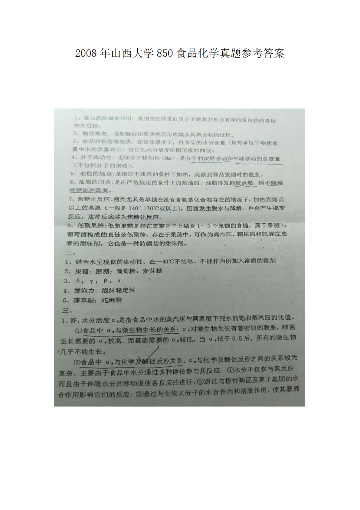 山西大学850食品化学2008年考研真题答案解析