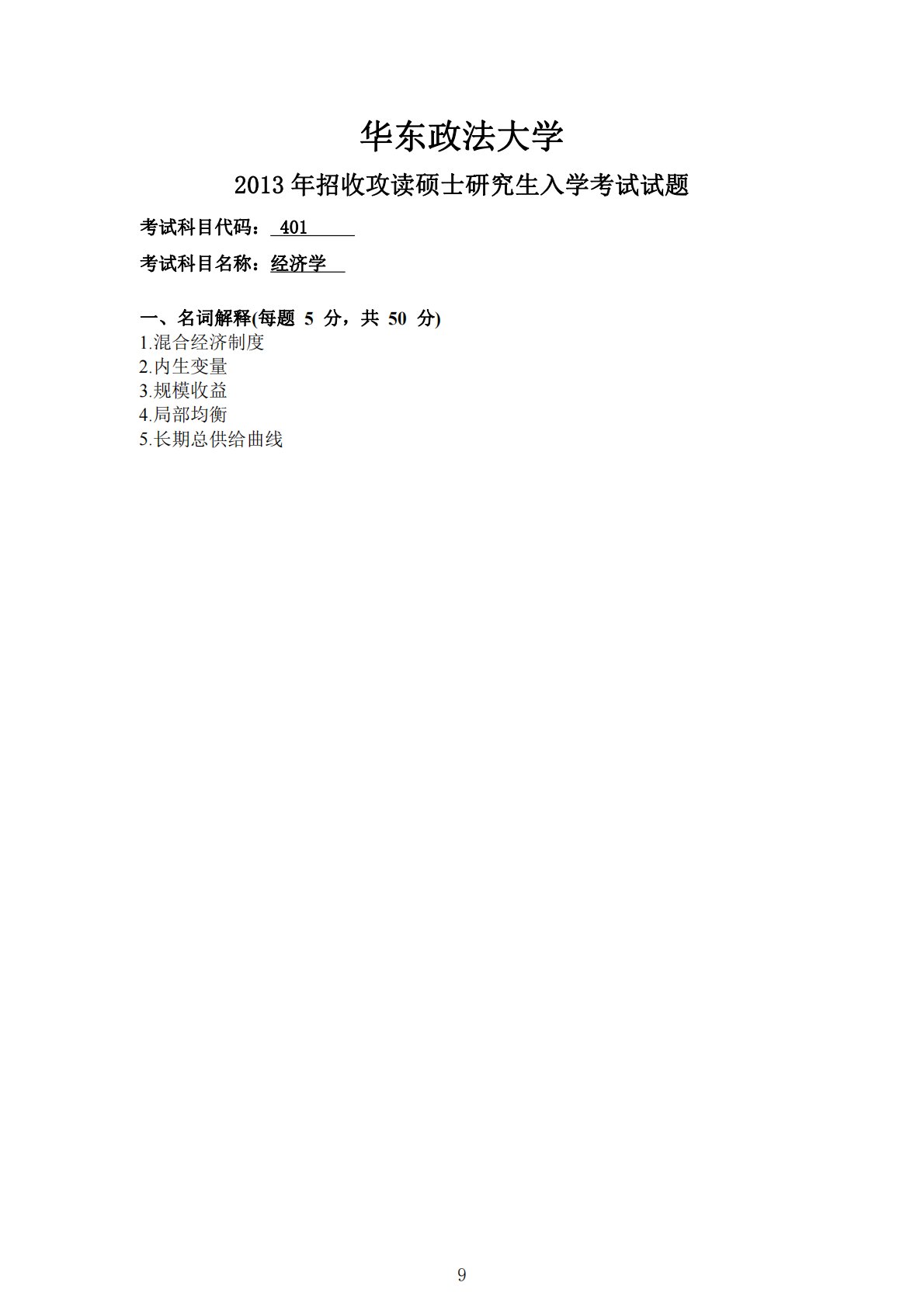 华东政法大学2013年招收攻读硕士研究生入学考试试题考试科目代码:401考试科目名称:经济学一、名词解释(每题5分,共50分)1.混合经济制度2.内生变量3.规模收益4.局部均衡5.长期总供给曲线9华东政法大学2013年招收攻读硕士研究生入学考试试题考试科目代码:401考试科目名称:经济学一、名词解释(每题5分,共50分)1.混合经济制度2.内生变量3.规模收益4.局部均衡5.长期总供给曲线6.洛伦兹曲线7.阿罗不可能定理8.逆向选择9.收入政策10.费雪方程二、简答题(每题8分,共40分)1.为什么完全竞争可以实现帕累托最优状态所需具备的条件?2.什么是平等与效率,如何处理好两者的关系?3....