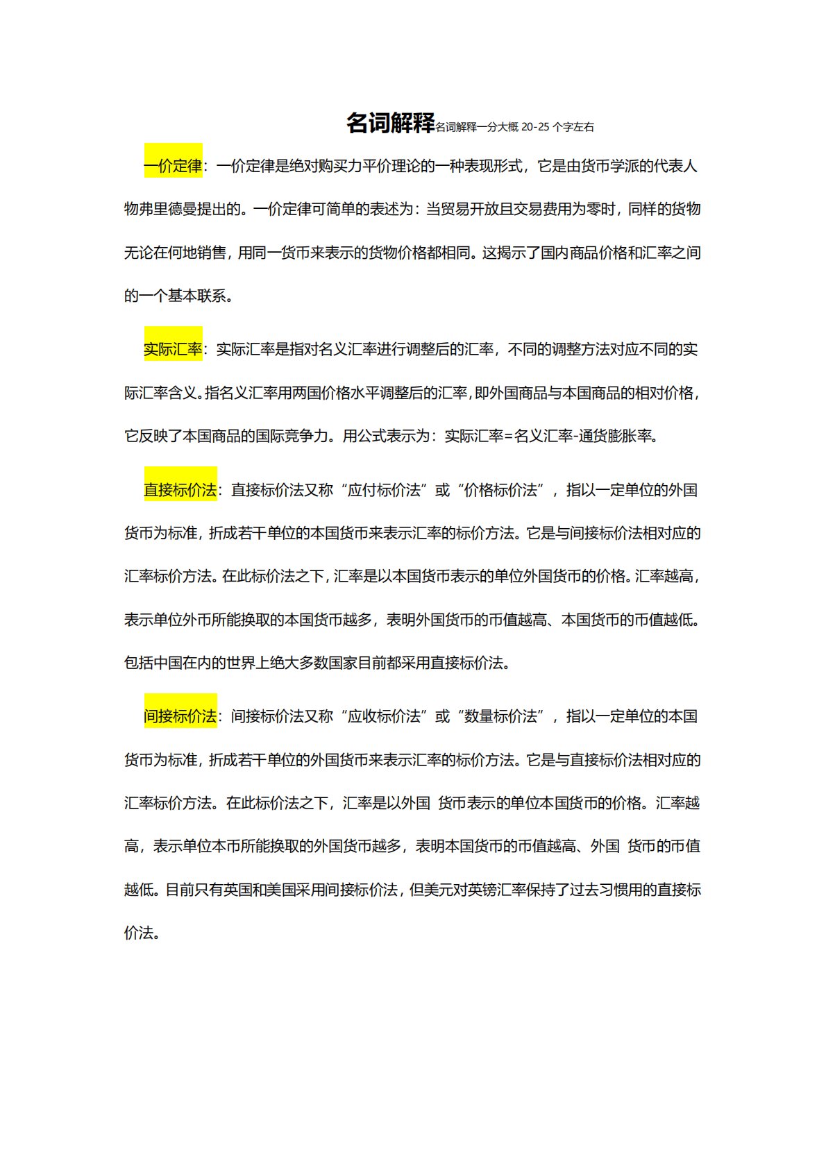 名词解释名词解释一分大概20-25个字左右一价定律:一价定律是绝对购买力平价理论的一种表现形式,它是由货币学派的代表人物弗里德曼提出的。一价定律可简单的表述为:当贸易开放且交易费用为零时,同样的货物无论在何地销售,用同一货币来表示的货物价格都相同。这揭示了国内商品价格和汇率之间的一个基本联系。实际汇率:实际汇率是指对名义汇率进行调整后的汇率,不同的调整方法对应不同的实际汇率含义。指名义汇率用两国价格水平调整后的汇率,即外国商品与本国商品的相对价格,它反映了本国商品的国际竞争力。用公式表示为:实际汇率=名义汇率-通货膨胀率。直接标价法:直接标价法又称“应付标价法”或“价格标价法”,指以一定单位的...