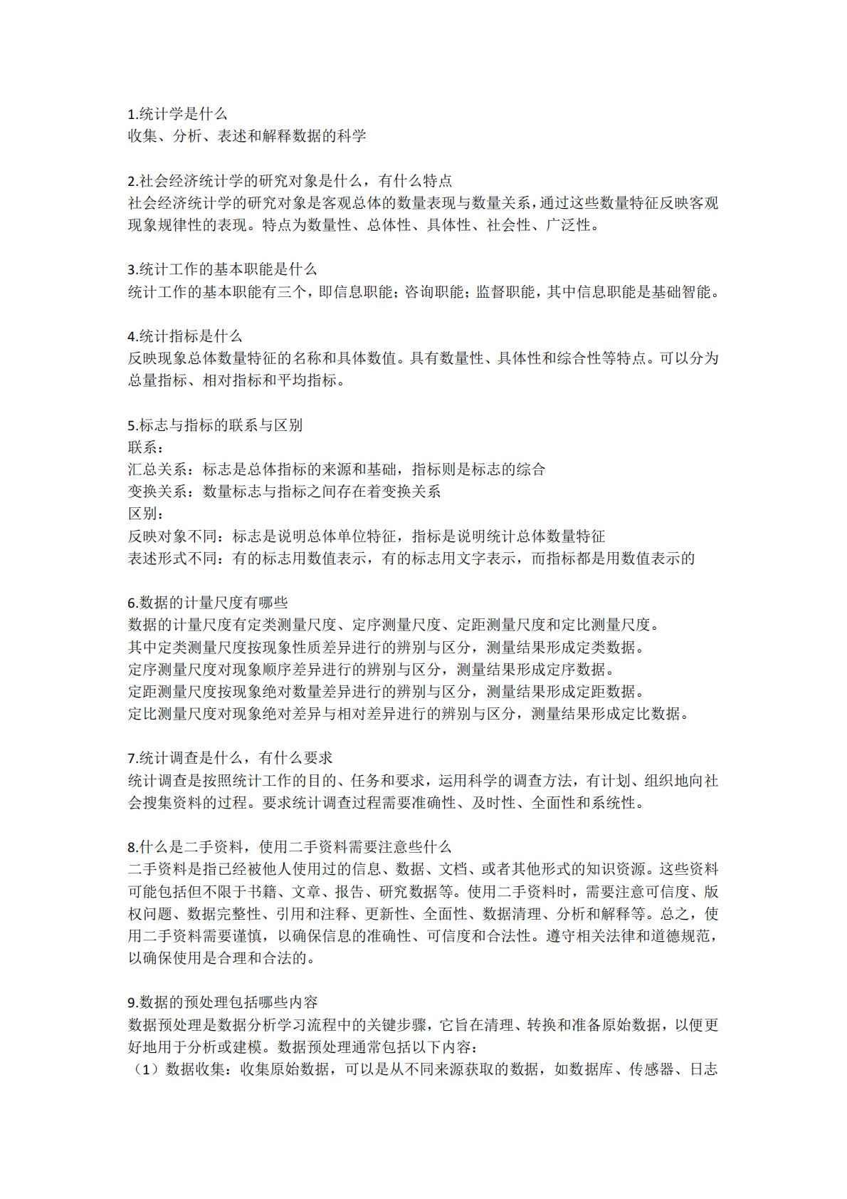 1.统计学是什么收集、分析、表述和解释数据的科学2.社会经济统计学的研究对象是什么,有什么特点社会经济统计学的研究对象是客观总体的数量表现与数量关系,通过这些数量特征反映客观现象规律性的表现。特点为数量性、总体性、具体性、社会性、广泛性。3.统计工作的基本职能是什么统计工作的基本职能有三个,即信息职能;咨询职能;监督职能,其中信息职能是基础智能。4.统计指标是什么反映现象总体数量特征的名称和具体数值。具有数量性、具体性和综合性等特点。可以分为总量指标、相对指标和平均指标。5.标志与指标的联系与区别联系:汇总关系:标志是总体指标的来源和基础,指标则是标志的综合变换关系:数量标志与指标之间存在着变...