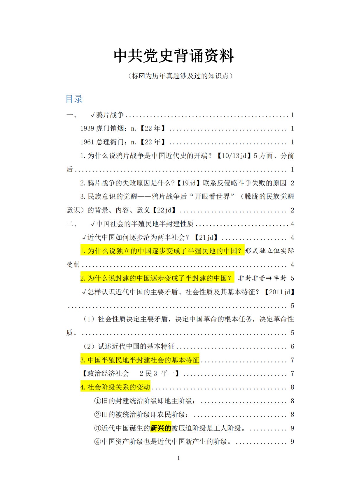 1中共党史背诵资料(标为历年真题涉及过的知识点)目录一、√鸦片战争...............................................11939虎门销烟:n.【22年】..................................11961总理衙门:n.【22年】..................................11.为什么说鸦片战争是中国近代史的开端?【10/13jd】5方面、分前后.............................................................12.鸦片战争的失败原因是什么?【19...