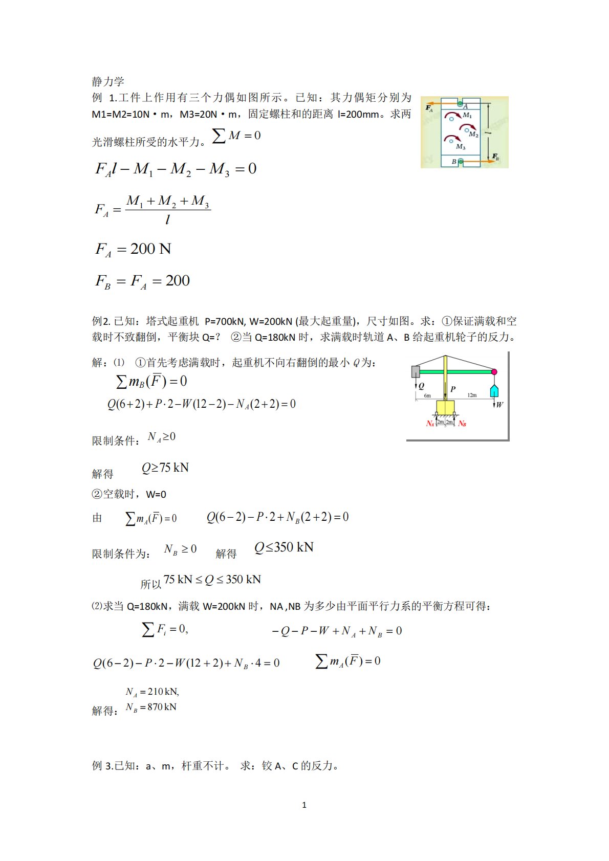 1静力学例1.工件上作用有三个力偶如图所示。已知:其力偶矩分别为M1=M2=10N·m,M3=20N·m,固定螺柱和的距离l=200mm。求两光滑螺柱所受的水平力。M0=AFlMMM−−−=1230=++123AFMMMlFA=200NFFBA==200例2.已知:塔式起重机P=700kN,W=200kN(最大起重量),尺寸如图。求:①保证满载和空载时不致翻倒,平衡块Q=?②当Q=180kN时,求满载时轨道A、B给起重机轮子的反力。解:⑴①首先考虑满载时,起重机不向右翻倒的最小Q为:限制条件:NA0解得Q75kN②空载时,W=0由AmF()0=QPNB−−++=(62)2(22)0限...