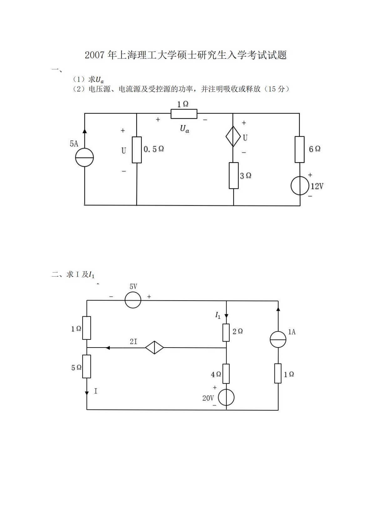 2007年上海理工大学硕士研究生入学考试试题一、(1)求(2)电压源、电流源及受控源的功率,并注明吸收或释放(15分)二、求I及1三、若R获得最大功率,则R需取何值,该最大功率为多少?(15分)四、图示正弦稳态电路,1=6A,2=8A,w=10rad/s,u与1相差90°,U=100V(15分)(1)画出所有电压、电流相量图。(2)求R、L、C五、Us=1.5+52sin2t+90°V,Is=2sin1.5tA,求UR.(15分)六、图示对称三相电路,线电压UL=380V,Z2=16+j12Ω,三角形负载的总功率为2KW,(感性),A1表的读数为10A,求:(1)表A2,A3,A的...