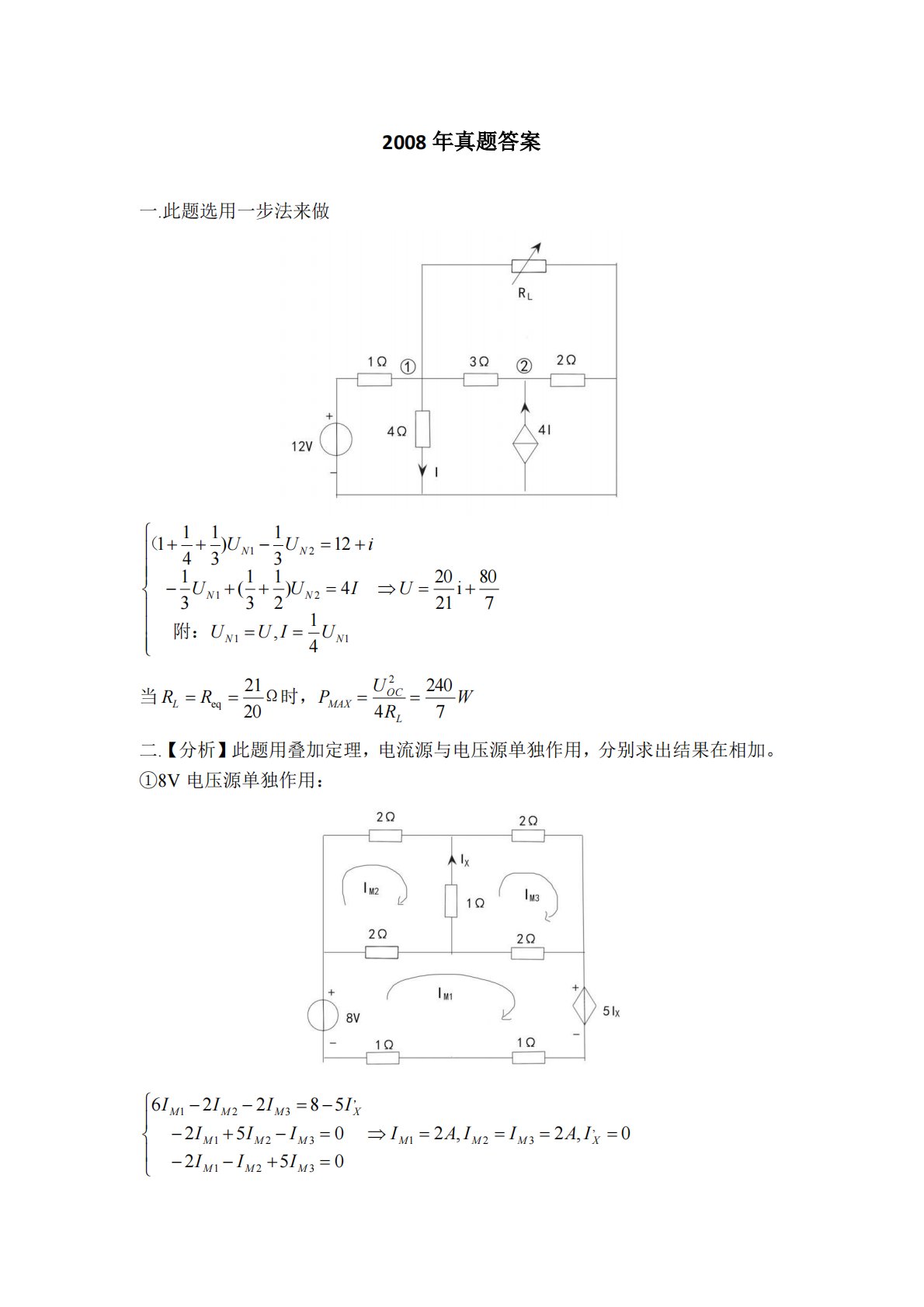 2008年真题答案一.此题选用一步法来做当二.【分析】此题用叠加定理,电流源与电压源单独作用,分别求出结果在相加。①8V电压源单独作用:780i212041,4)2131(311231)31411112121+====++−+=−++UUIUUIUUiUUNNNNNN附:(WRUPRRLOCMAXL7240420212eq====Ω时,0,2,205205258226,321321321321=====+−−=−+−−=−−XMMMMMMMMMXMMMIAIIAIIIIIIIIIII,②3A电流源单独作用综上,由叠加定理,三.以接地点4为基准点附:U=UN2-3...