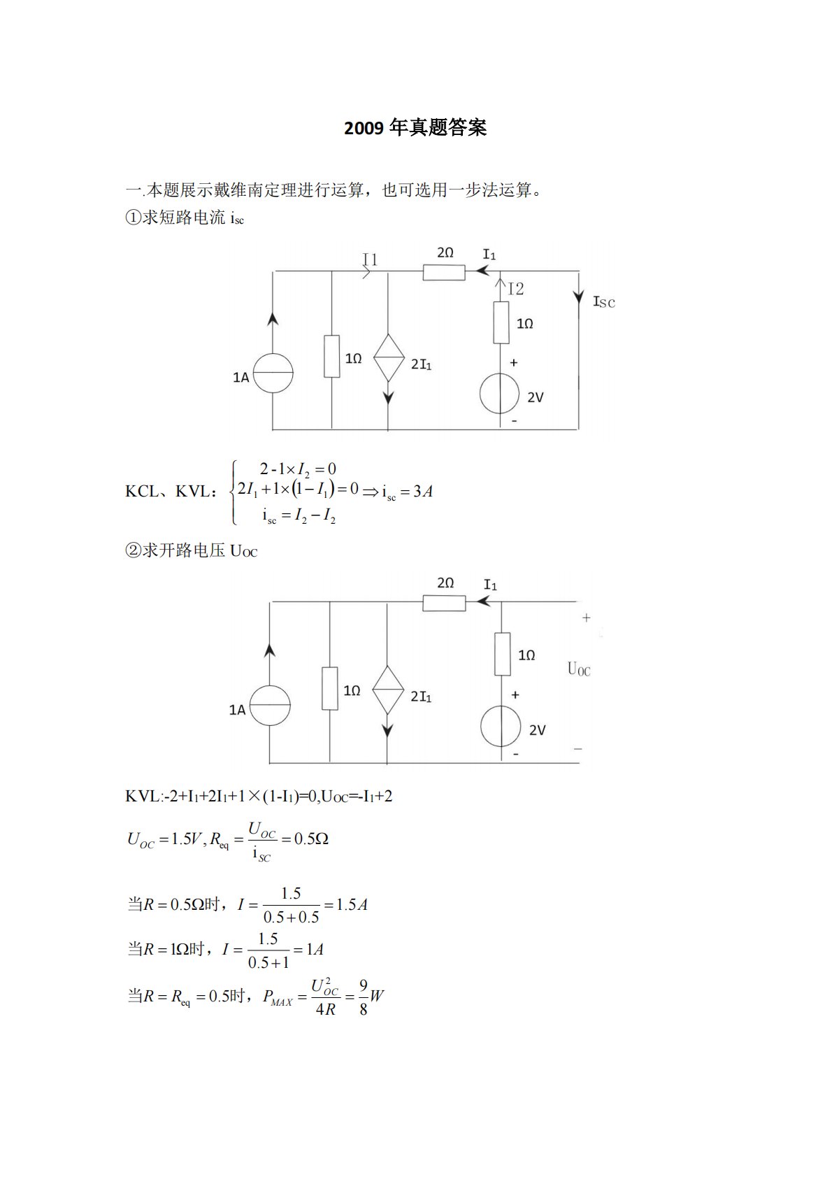 2009年真题答案一.本题展示戴维南定理进行运算,也可选用一步法运算。①求短路电流iscKCL、KVL:②求开路电压UOCKVL:-2+I1+2I1+1×(1-I1)=0,UOC=-I1+2()AIIIII3ii011201-2sc22sc112=−==−+====5.0i,5.1eqSCOCOCURVUWRUPRRAIRAIROCMAX8945.0115.05.115.15.05.05.15.02eq=====+===+==时,当时,当时,当二.【分析】用叠加定理可方便求解①当3A电流源独立工作时:电路右半部分构成了电桥②当2V电压源单独作用时网孔电流:AAICCVSI...