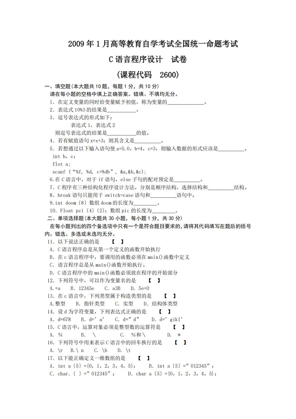 2009年1月高等教育自学考试全国统一命题考试C语言程序设计试卷(课程代码2600)一、填空题(本大题共10题,每题1分,共10分)请在每小题的空格中填上正确答案。错填、不填均无分。1.在定义变量的同时给变量赋予初值,称为变量的______________。2.表达式10%3的结果是___________。3.逗号表达式的形式如下:表达式1,表达式2则逗号表达式的结果是___________的值。4.若有赋值语句x=x+3;则其含义是__________。5.若想通过以下输入语句使a=5.0,b=4,c=3,则输入数据的形式应该是__________。intb,c;flota;scanf(“%...