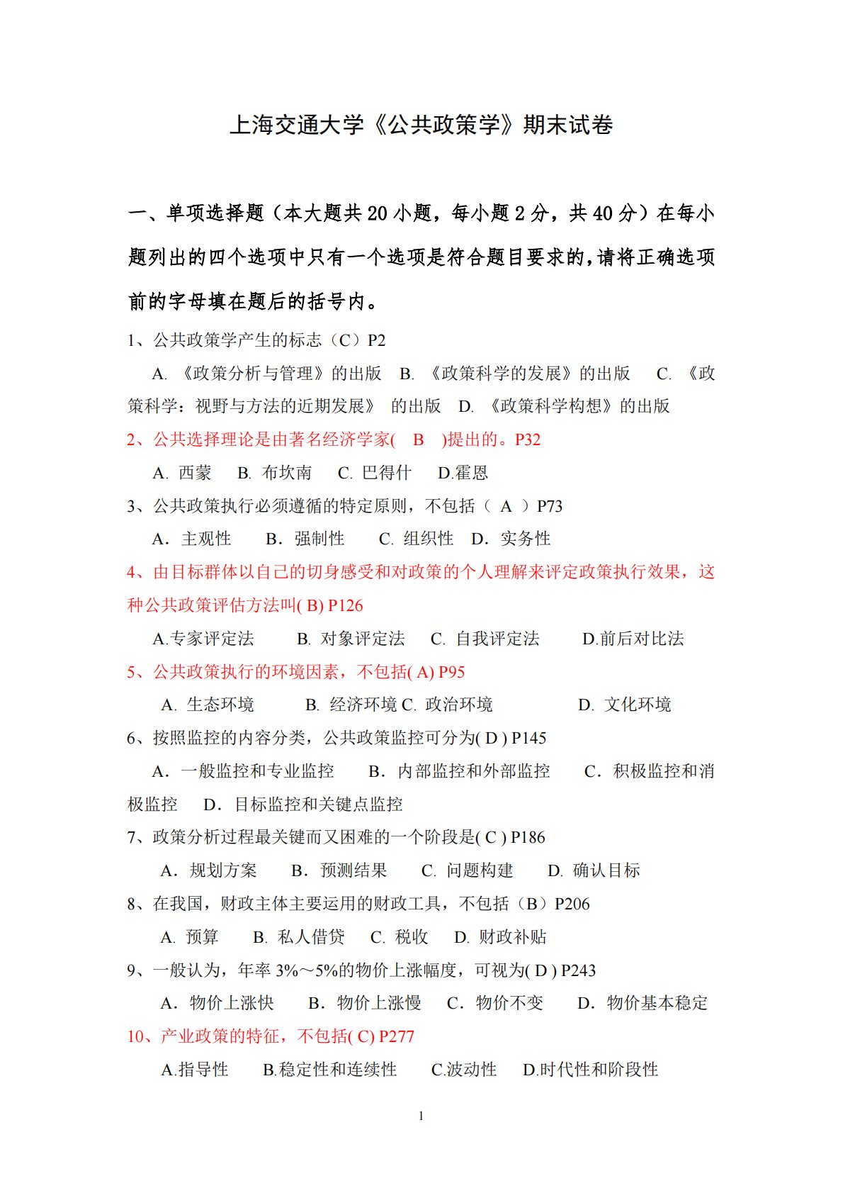 1上海交通大学《公共政策学》期末试卷一、单项选择题(本大题共20小题,每小题2分,共40分)在每小题列出的四个选项中只有一个选项是符合题目要求的,请将正确选项前的字母填在题后的括号内。1、公共政策学产生的标志(C)P2A.《政策分析与管理》的出版B.《政策科学的发展》的出版C.《政策科学:视野与方法的近期发展》的出版D.《政策科学构想》的出版2、公共选择理论是由著名经济学家(B)提出的。P32A.西蒙B.布坎南C.巴得什D.霍恩3、公共政策执行必须遵循的特定原则,不包括(A)P73A.主观性B.强制性C.组织性D.实务性4、由目标群体以自己的切身感受和对政策的个人理解来评定政策执行效果,这种公...