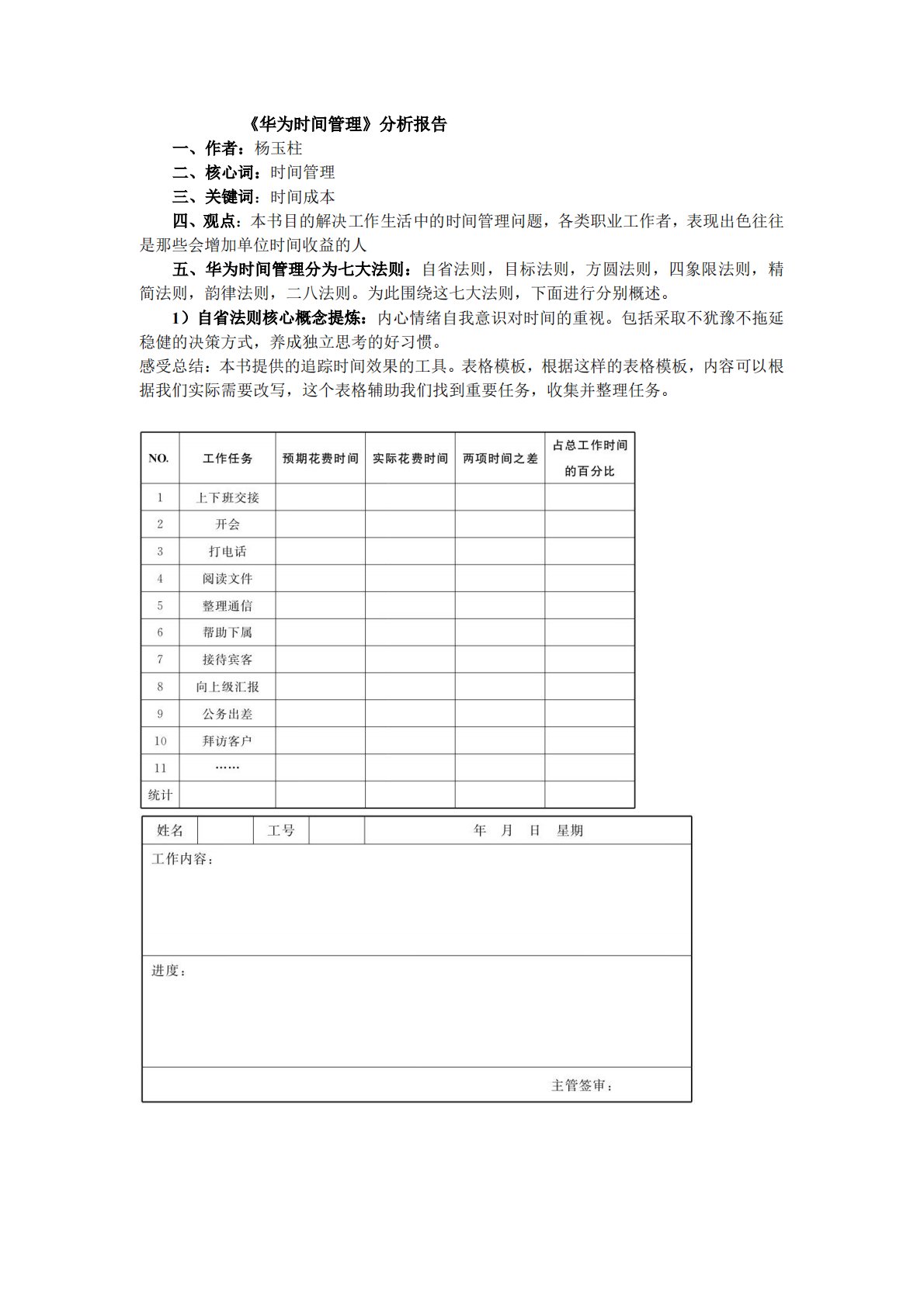 《华为时间管理》分析报告一、作者:杨玉柱二、核心词:时间管理三、关键词:时间成本四、观点:本书目的解决工作生活中的时间管理问题,各类职业工作者,表现出色往往是那些会增加单位时间收益的人五、华为时间管理分为七大法则:自省法则,目标法则,方圆法则,四象限法则,精简法则,韵律法则,二八法则。为此围绕这七大法则,下面进行分别概述。1)自省法则核心概念提炼:内心情绪自我意识对时间的重视。包括采取不犹豫不拖延稳健的决策方式,养成独立思考的好习惯。感受总结:本书提供的追踪时间效果的工具。表格模板,根据这样的表格模板,内容可以根据我们实际需要改写,这个表格辅助我们找到重要任务,收集并整理任务。2)目标法则5W...