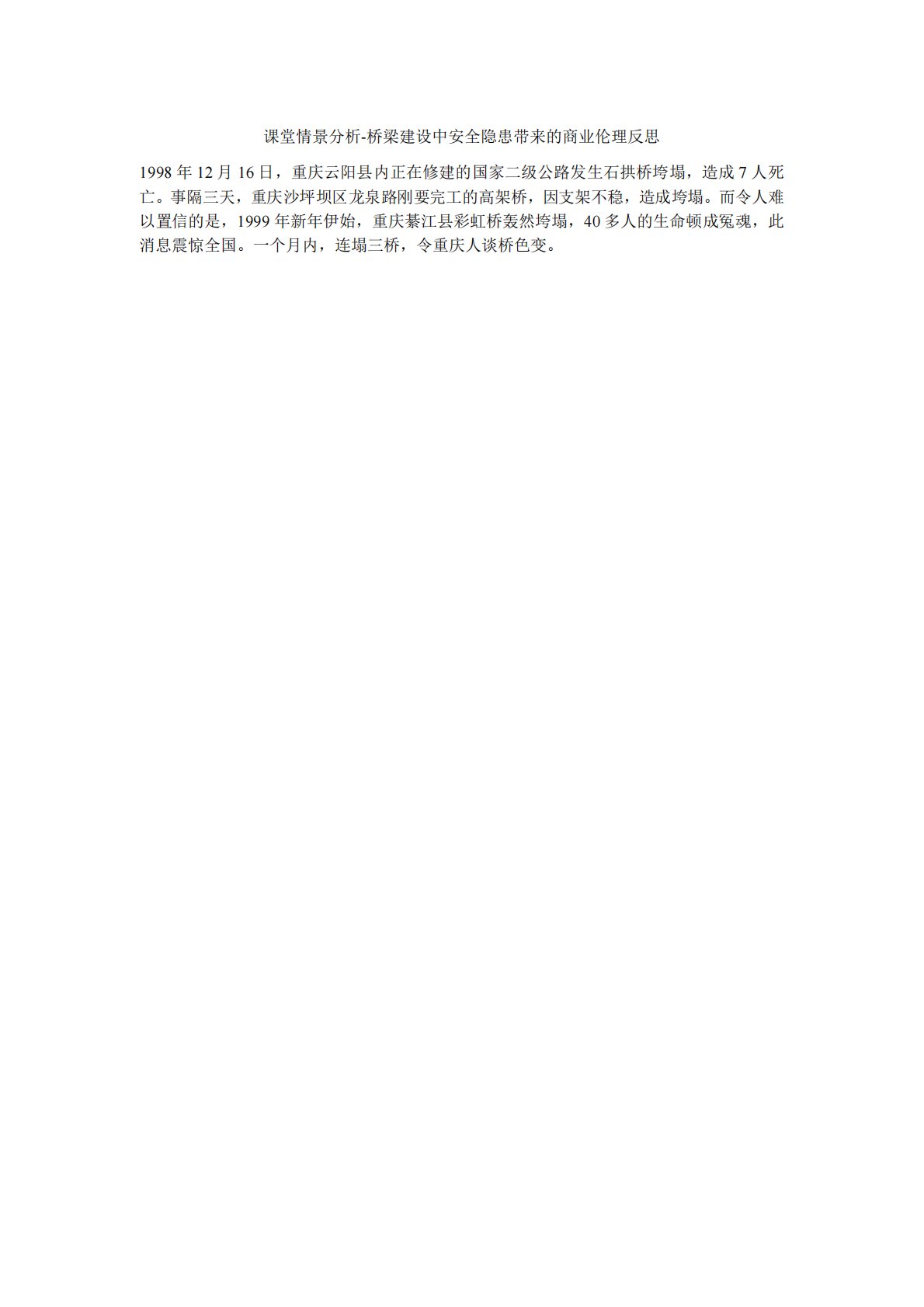 课堂情景分析-桥梁建设中安全隐患带来的商业伦理反思1998年12月16日,重庆云阳县内正在修建的国家二级公路发生石拱桥垮塌,造成7人死亡。事隔三天,重庆沙坪坝区龙泉路刚要完工的高架桥,因支架不稳,造成垮塌。而令人难以置信的是,1999年新年伊始,重庆綦江县彩虹桥轰然垮塌,40多人的生命顿成冤魂,此消息震惊全国。一个月内,连塌三桥,令重庆人谈桥色变。课堂情景分析-桥梁建设中安全隐患带来的商业伦理反思1998年12月16日,重庆云阳县内正在修建的国家二级公路发生石拱桥垮塌,造成7人死亡。事隔三天,重庆沙坪坝区龙泉路刚要完工的高架桥,因支架不稳,造成垮塌。而令人难以置信的是,1999年新年伊始,重庆...