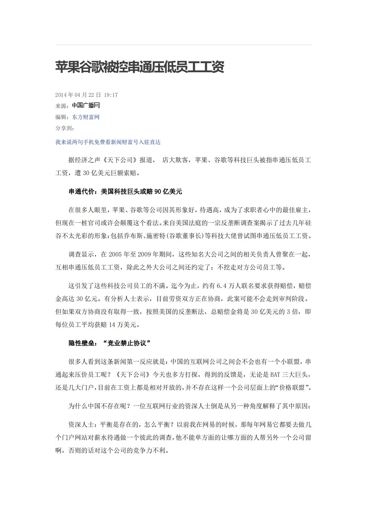 苹果谷歌被控串通压低员工工资2014年04月22日19:17来源:编辑:东方财富网分享到:我来说两句手机免费看新闻财富号入驻直达据经济之声《天下公司》报道,店大欺客,苹果、谷歌等科技巨头被指串通压低员工工资,遭30亿美元巨额索赔。串通代价:美国科技巨头或赔90亿美元在很多人眼里,苹果、谷歌等公司因其形象好,待遇高,成为了求职者心中的最佳雇主,但现在一桩官司或许会颠覆这个看法。来自美国法庭的一宗反垄断调查案揭示了过去几年硅谷不太光彩的形象:包括乔布斯、施密特(谷歌董事长)等科技大佬曾试图串通压低员工工资。调查显示,在2005年至2009年期间,这些知名大公司之间的相关负责人曾聚在一起,互相串通压...