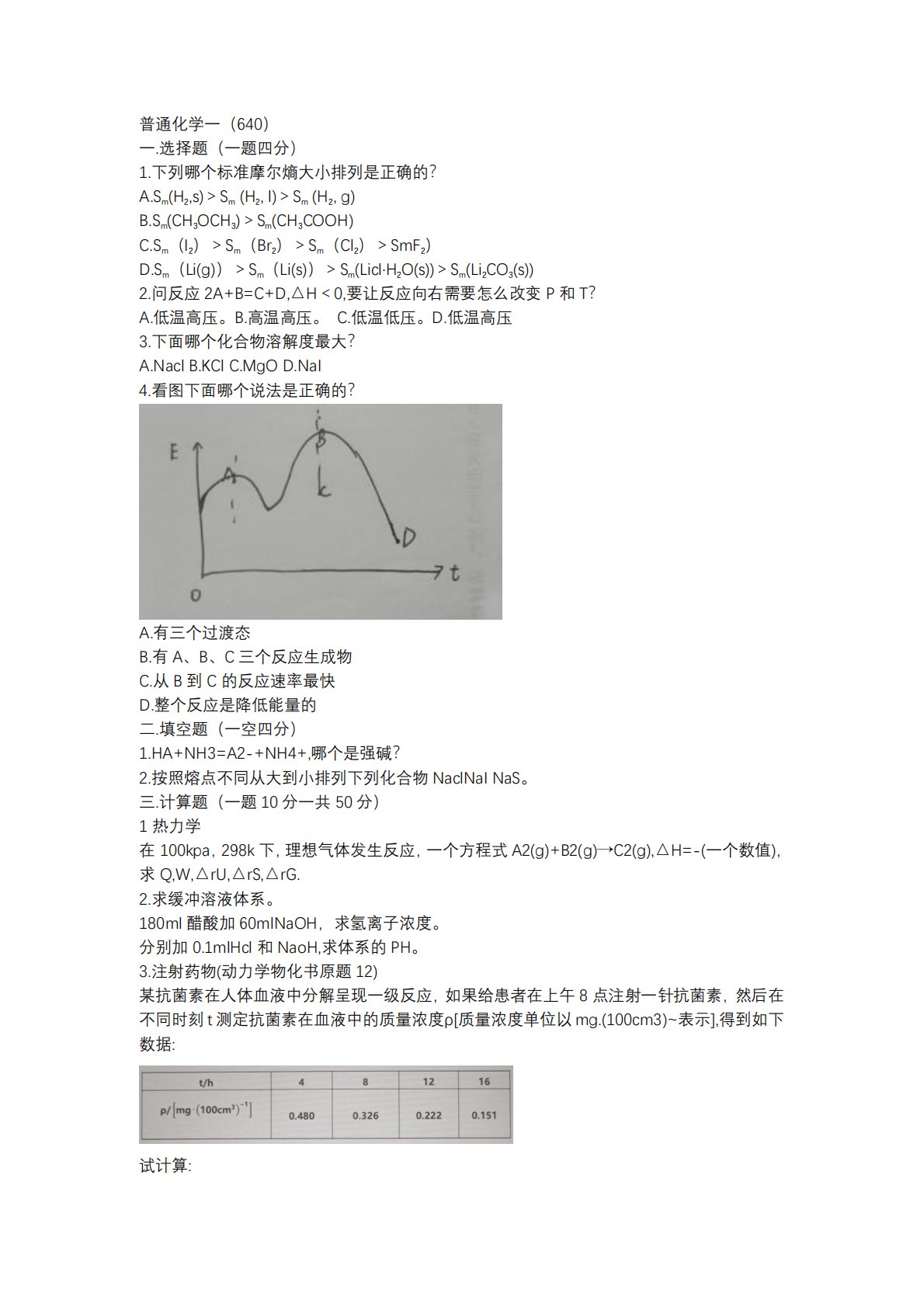 普通化学一(640)一.选择题(一题四分)1.下列哪个标准摩尔熵大小排列是正确的?A.Sm(H2,s)>Sm(H2,l)>Sm(H2,g)B.Sm(CH3OCH3)>Sm(CH3COOH)C.Sm(I2)>Sm(Br2)>Sm(Cl2)>SmF2)D.Sm(Li(g))>Sm(Li(s))>Sm(Licl·H2O(s))>Sm(Li2CO3(s))2.问反应2A+B=C+D,△H<0,要让反应向右需要怎么改变P和T?A.低温高压。B.高温高压。C.低温低压。D.低温高压3.下面哪个化合物溶解度最大?A.NaclB.KClC.MgOD.NaI4.看图下面哪个说法是正确的?A.有三个过渡态B.有A...