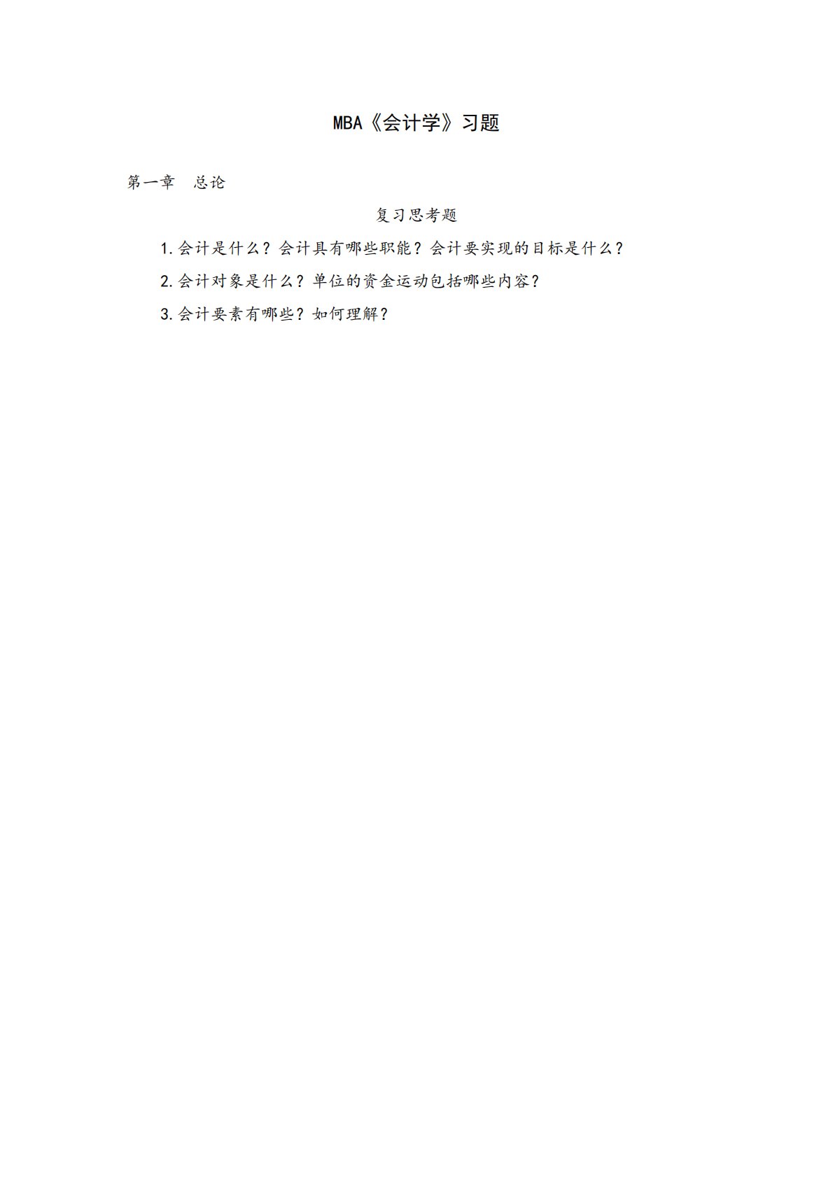 MBA《会计学》习题第一章总论复习思考题1.会计是什么?会计具有哪些职能?会计要实现的目标是什么?2.会计对象是什么?单位的资金运动包括哪些内容?3.会计要素有哪些?如何理解?MBA《会计学》习题第一章总论复习思考题1.会计是什么?会计具有哪些职能?会计要实现的目标是什么?2.会计对象是什么?单位的资金运动包括哪些内容?3.会计要素有哪些?如何理解?4.会计核算的基本前提(假设)有哪些?如何理解?5.请简述会计核算的方法。6.会计的计量属性是哪些?如何使用?7.会计法律规范的层级有哪些?如何理解依法办理会计事务?百校文库—海量高校资料共享库百校文库是一个线上大学生专业学习资料共享平台,致力于通...