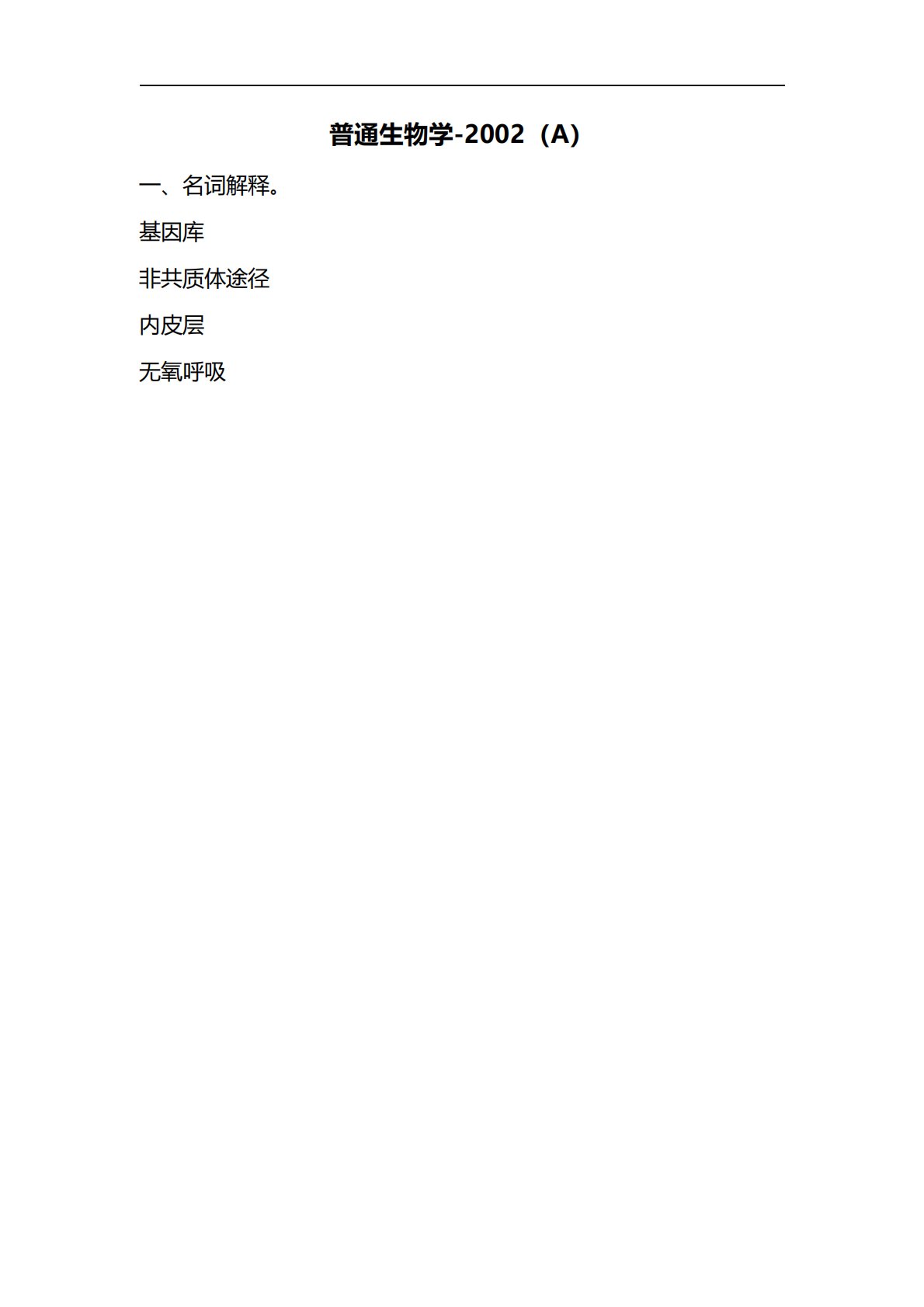 普通生物学-2002(A)一、名词解释。基因库非共质体途径内皮层无氧呼吸普通生物学-2002(A)一、名词解释。基因库非共质体途径内皮层无氧呼吸再生作用适应光敏色素双名法原核细胞氧化磷酸化二、问答题1、请叙述生物膜的结构及其功能2、单子叶植物茎的构造和双子叶植物的茎有何不同?3、试述生长素在植物体内的分布和作用4、试述人体对环境化学污染物可能的吸收和排除途径5、碳、氮元素的转化循环为试以例,说明微生物在自然界中的地位和作用百校文库—海量高校资料共享库百校文库是一个线上大学生专业学习资料共享平台,致力于通过用户自主上传与分享,打造一个涵盖各大高校、各学科门类的免费资源中心。平台已积累50万+套历...