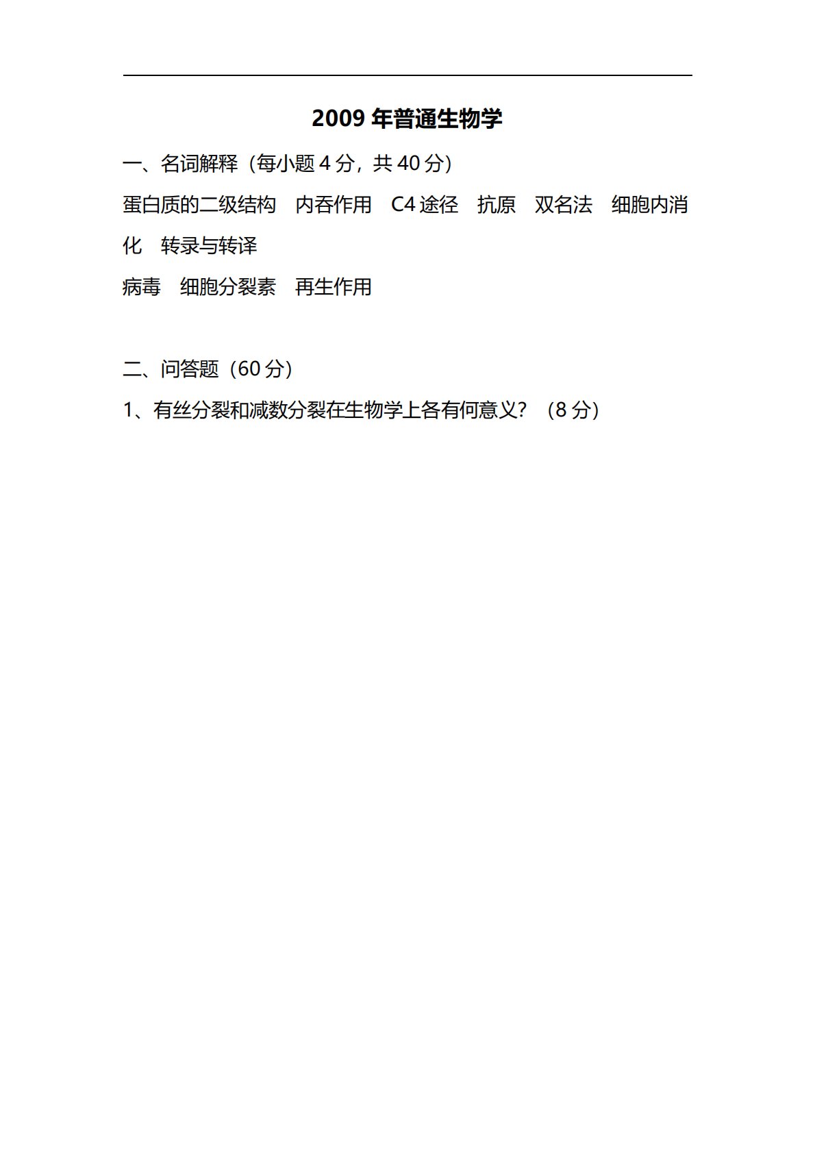 2009年普通生物学一、名词解释(每小题4分,共40分)蛋白质的二级结构内吞作用C4途径抗原双名法细胞内消化转录与转译病毒细胞分裂素再生作用二、问答题(60分)1、有丝分裂和减数分裂在生物学上各有何意义?(8分)2009年普通生物学一、名词解释(每小题4分,共40分)蛋白质的二级结构内吞作用C4途径抗原双名法细胞内消化转录与转译病毒细胞分裂素再生作用二、问答题(60分)1、有丝分裂和减数分裂在生物学上各有何意义?(8分)2、叙述植物体的组织类型及其功能。(10分)3、叙述红光和远红光对植物开花的影响,并分析原因。(10分)4、请比较B淋巴细胞和T淋巴细胞的差别。(10分)5、动物的运输系统在进...