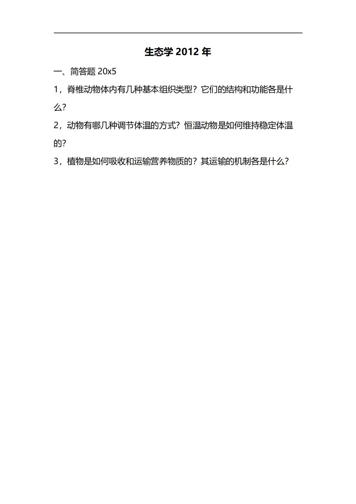 生态学2012年一、简答题20x51,脊椎动物体内有几种基本组织类型?它们的结构和功能各是什么?2,动物有哪几种调节体温的方式?恒温动物是如何维持稳定体温的?3,植物是如何吸收和运输营养物质的?其运输的机制各是什么?生态学2012年一、简答题20x51,脊椎动物体内有几种基本组织类型?它们的结构和功能各是什么?2,动物有哪几种调节体温的方式?恒温动物是如何维持稳定体温的?3,植物是如何吸收和运输营养物质的?其运输的机制各是什么?4,T2噬菌体侵入大肠杆菌并增殖的步骤是什么?该实验的结果有什么重要意义?5,请叙述从低等到高等的各种陆生植物类群适应陆地生活的进化特征。2011二、论述题25x21,...